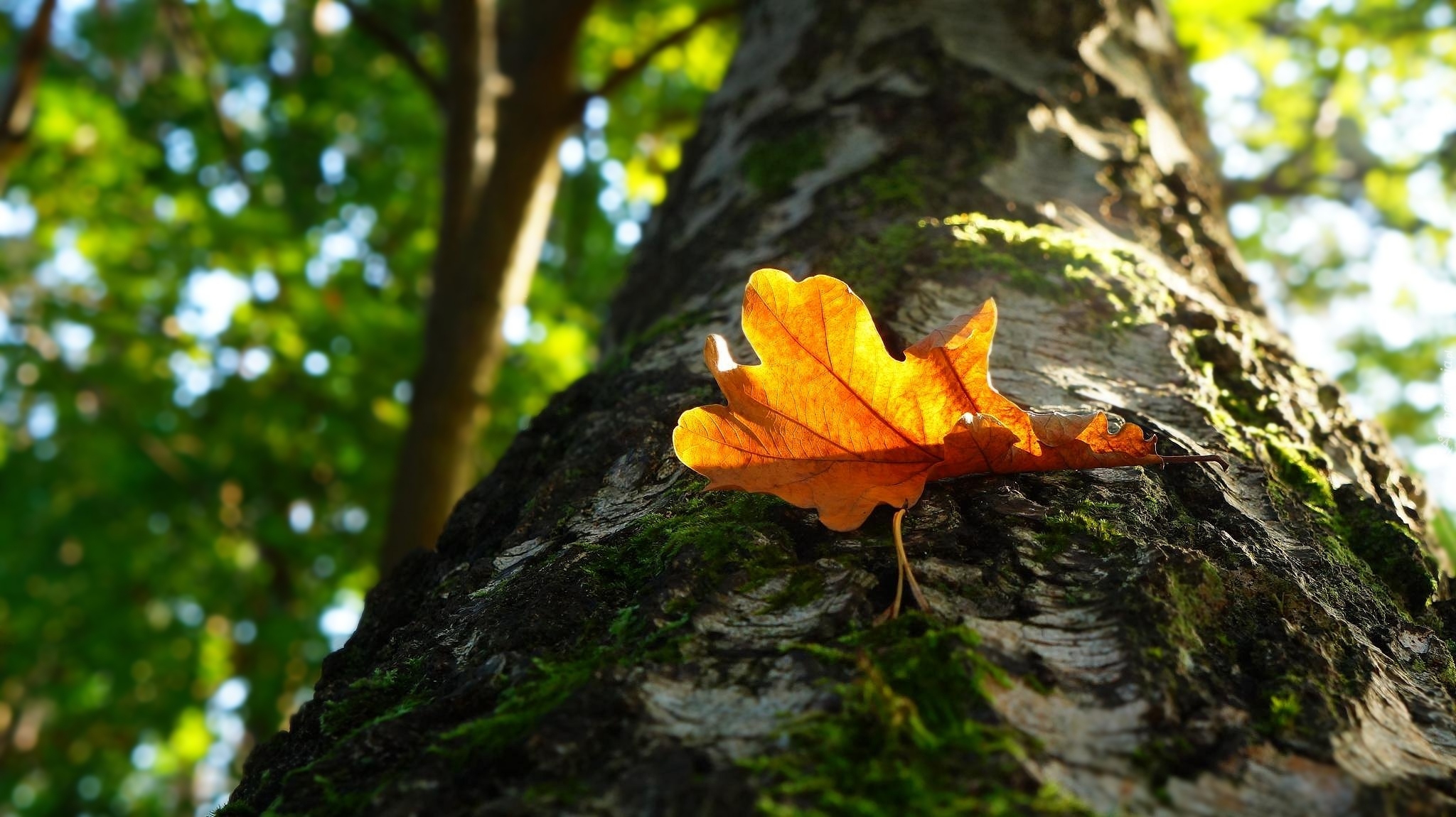 Edytor tapety: Uschnięty liść zaczepił o pień brzozy
