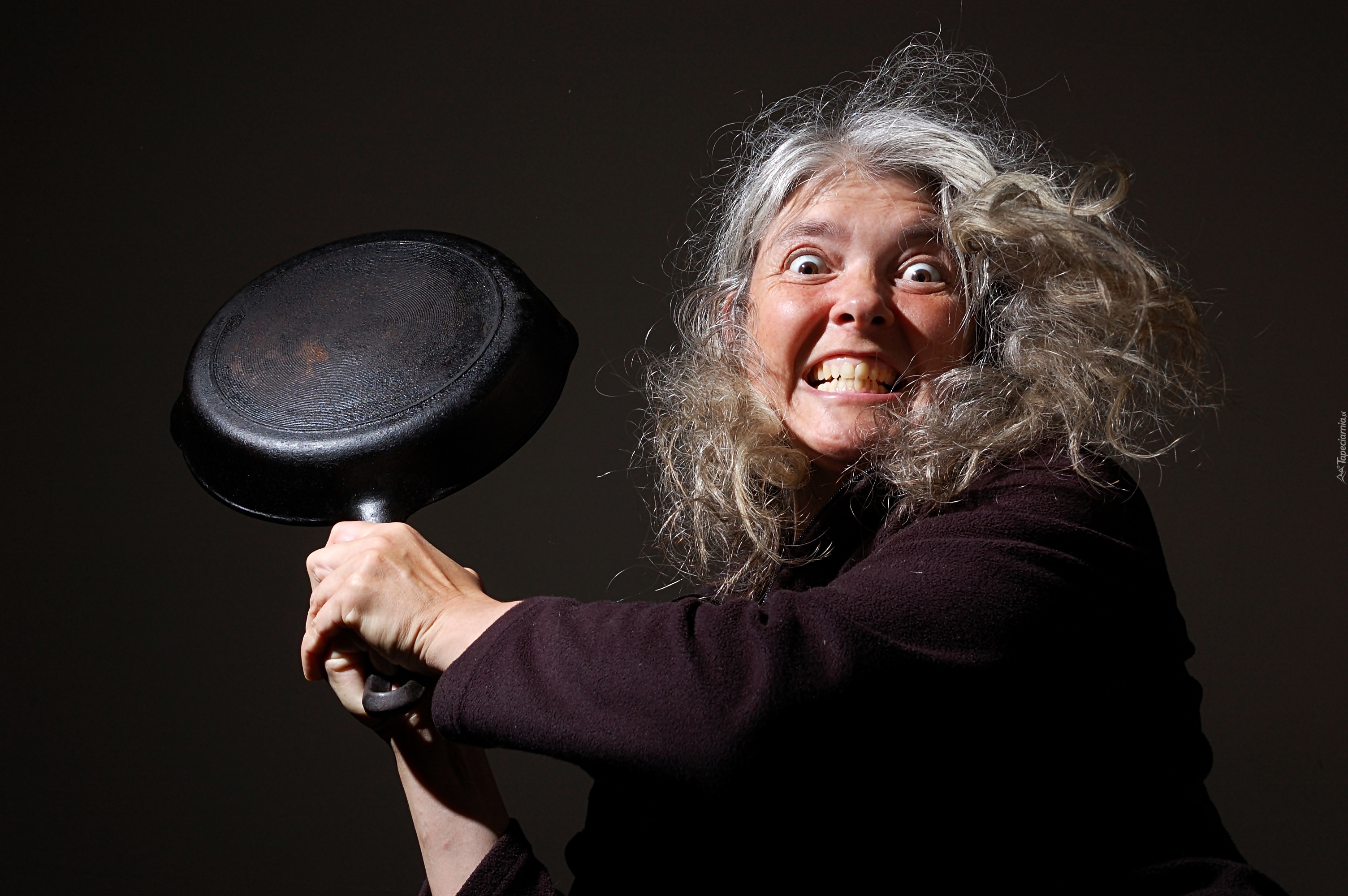 Edytor tapety: Zdenerwowana kobieta z patelnią