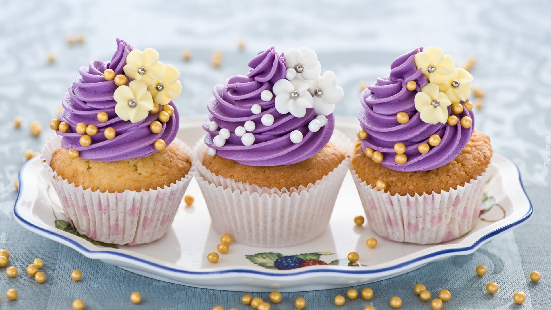 Edytor tapety: Trzy babeczki z kremem na półmisku