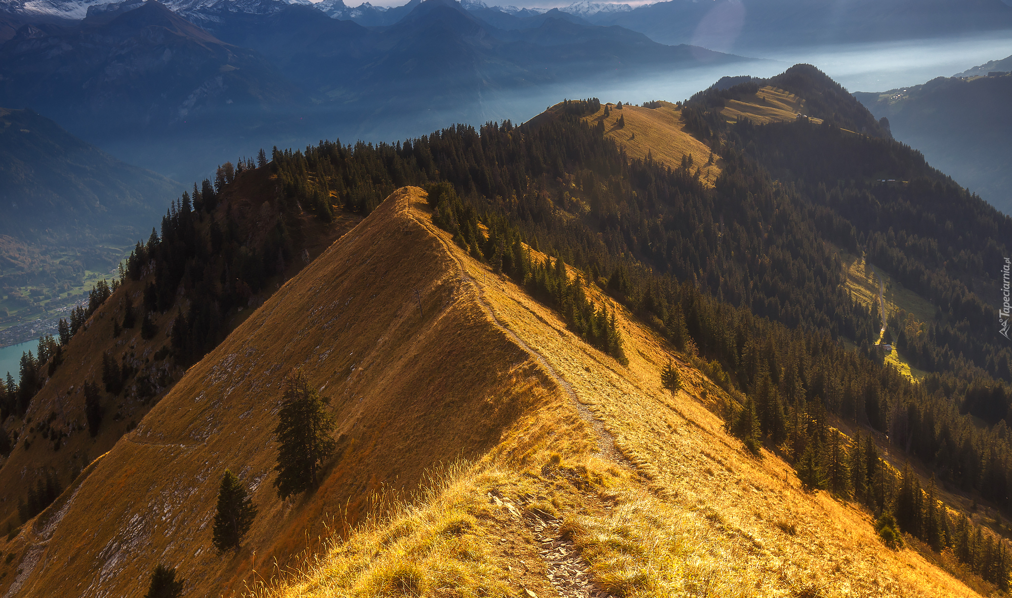 Edytor tapety: Szczyt góry porośnięty drzewami i uschniętą trawą