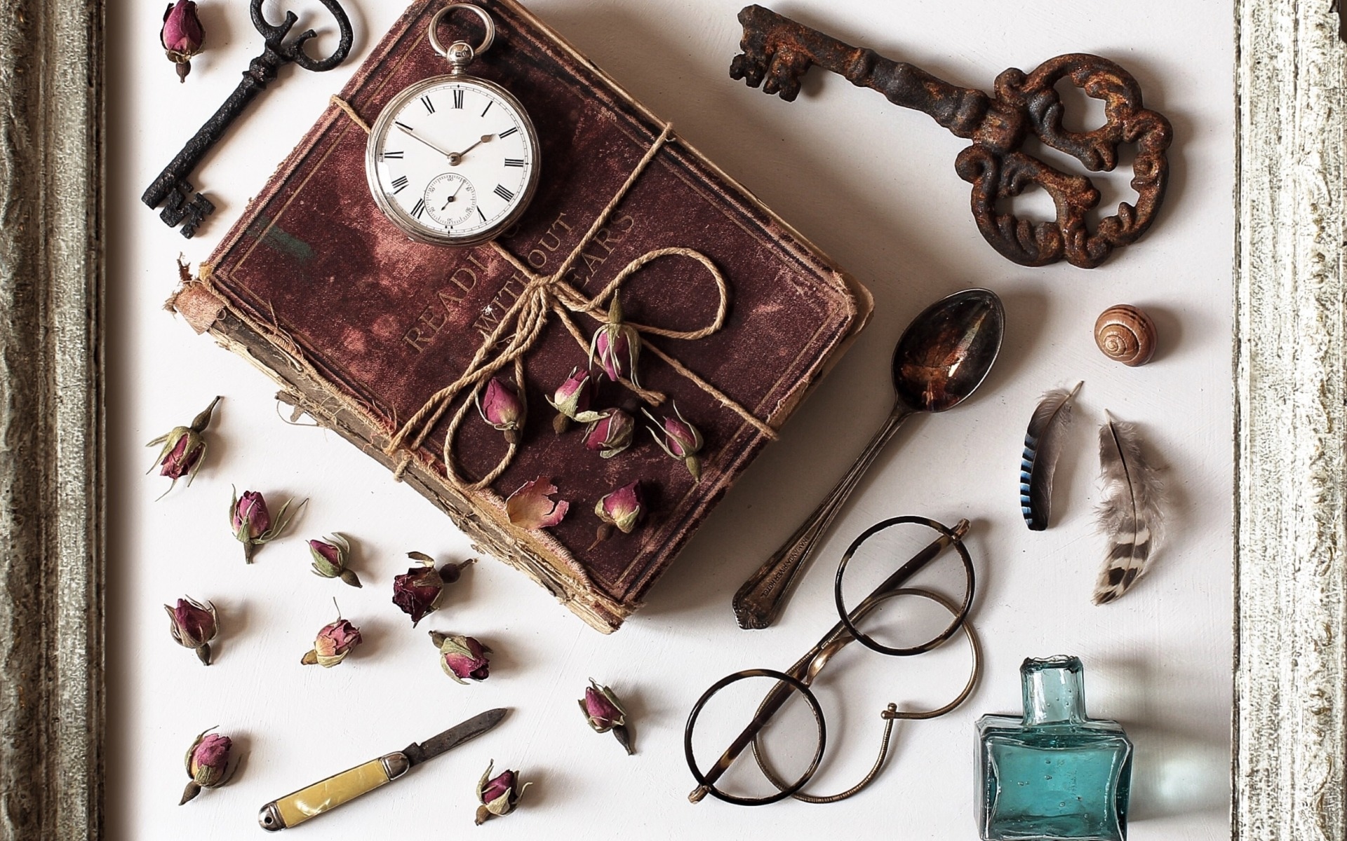 Edytor tapety: Zardzewiałe klucze obok starej książki przewiązanej sznurkiem