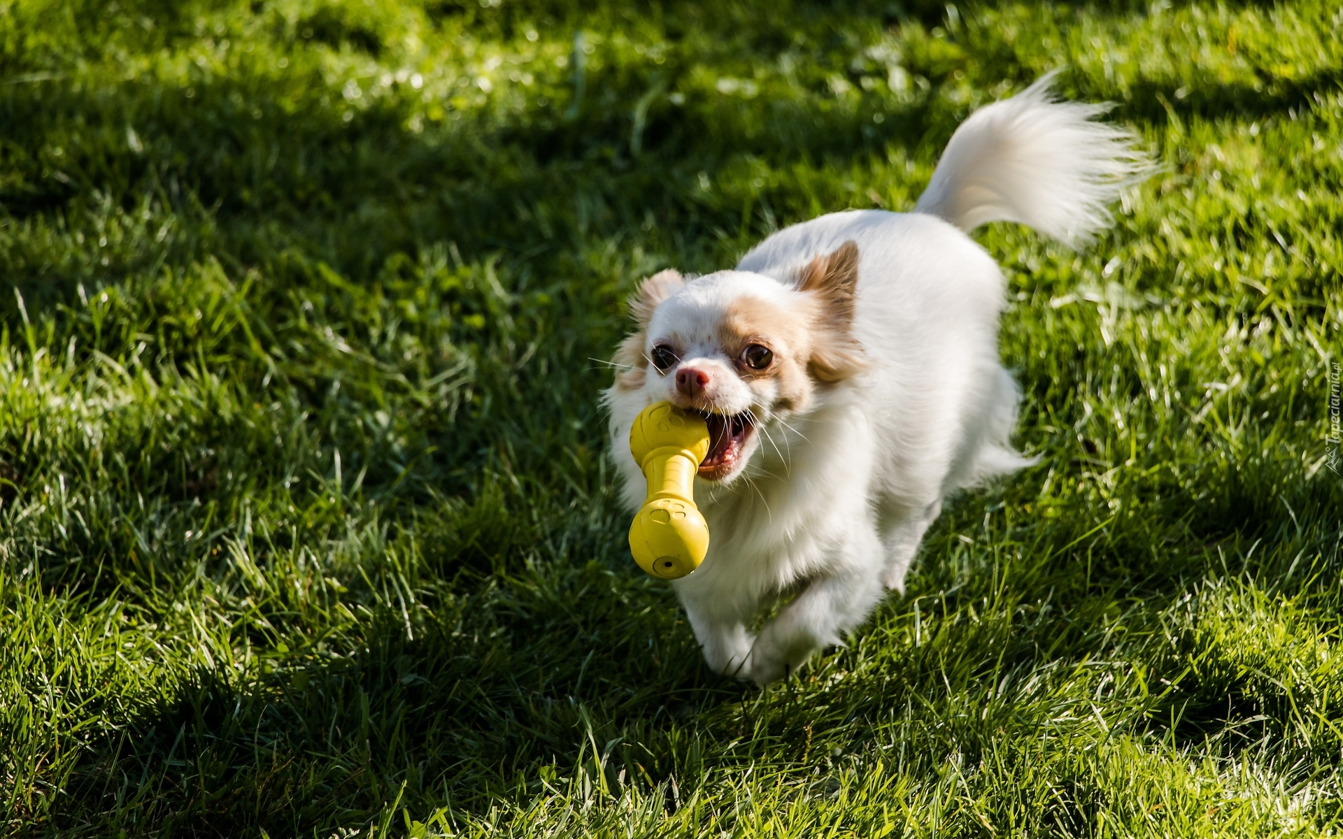 Edytor tapety: Chihuahua z zabawką biegnie po trawie