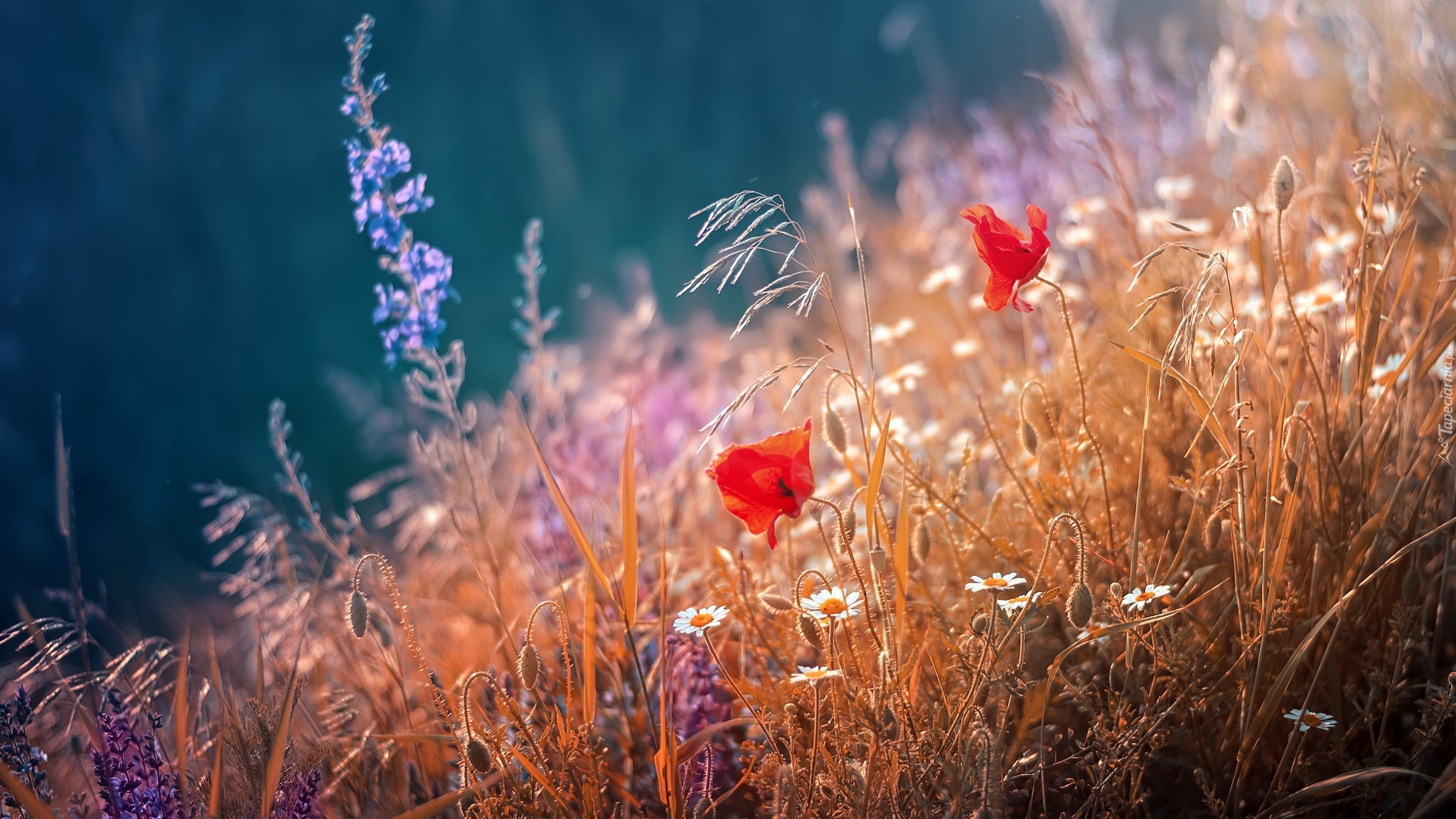 Edytor tapety: Maki, margerytki i trawy na łące