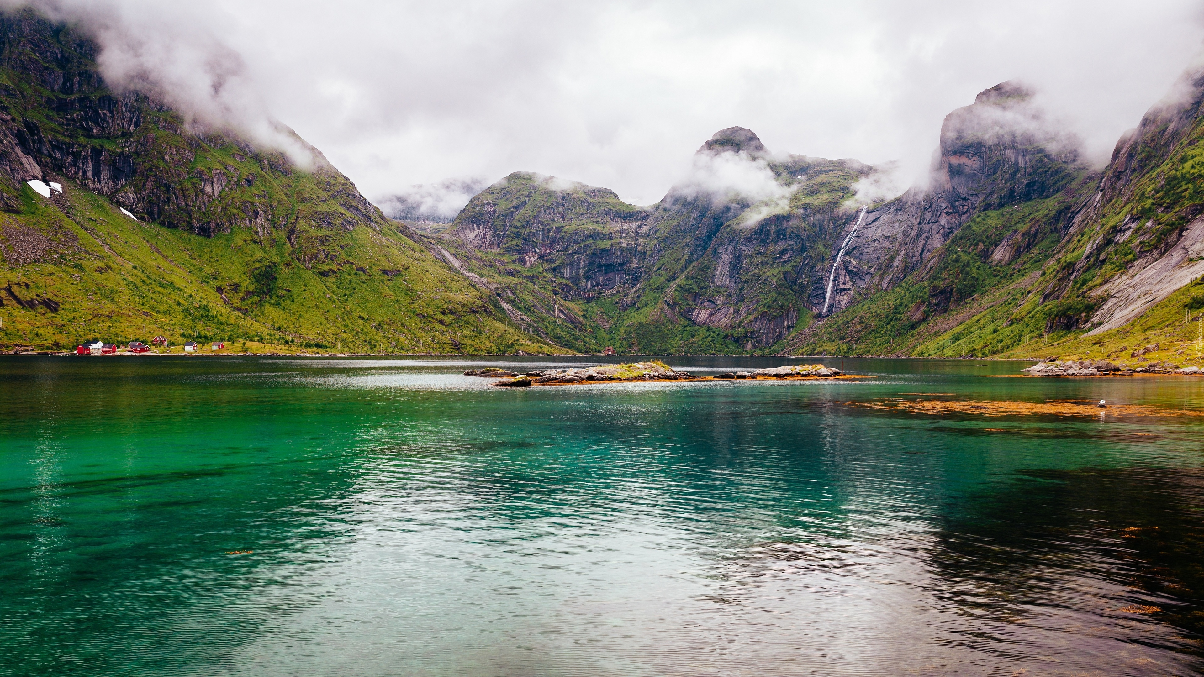 Edytor tapety: Wieś na norweskich Lofotach we mgle