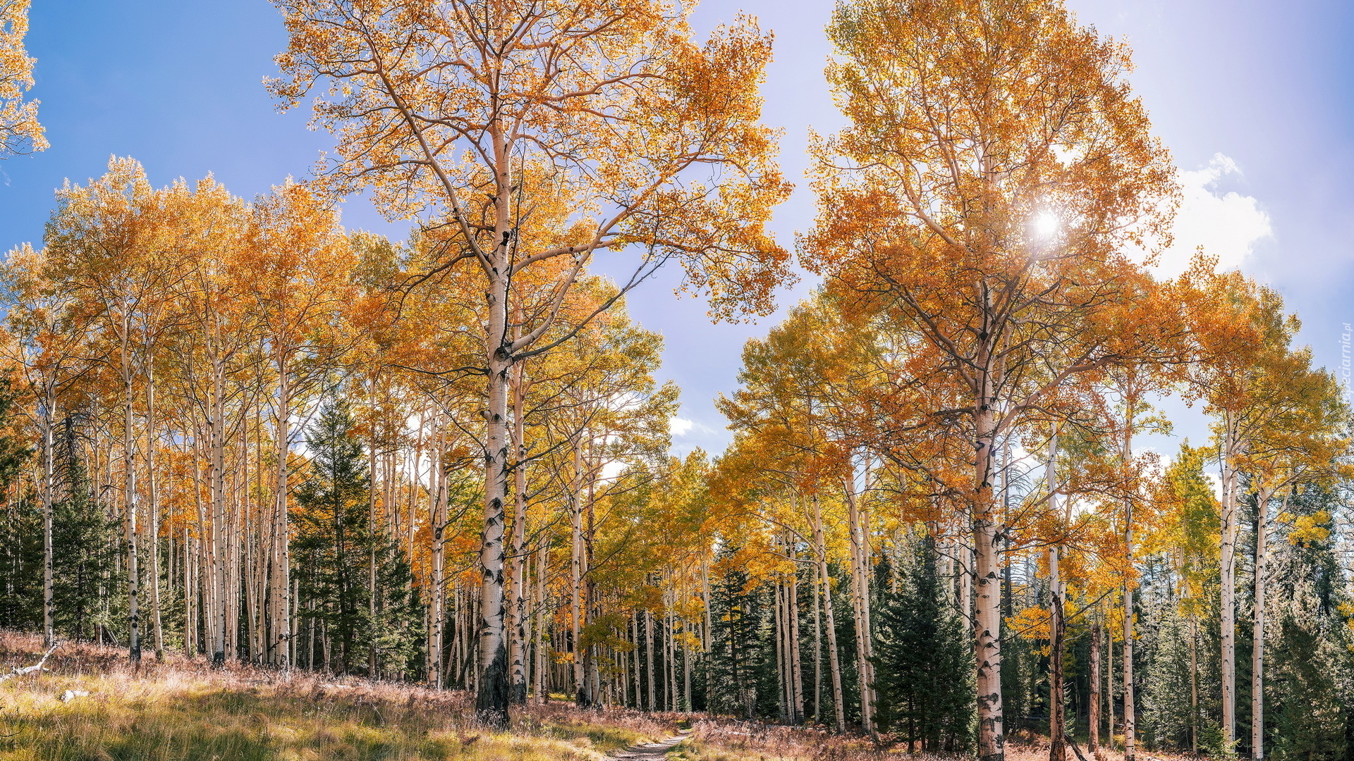 Edytor tapety: Promienie słońca nad brzozowym zagajnikiem