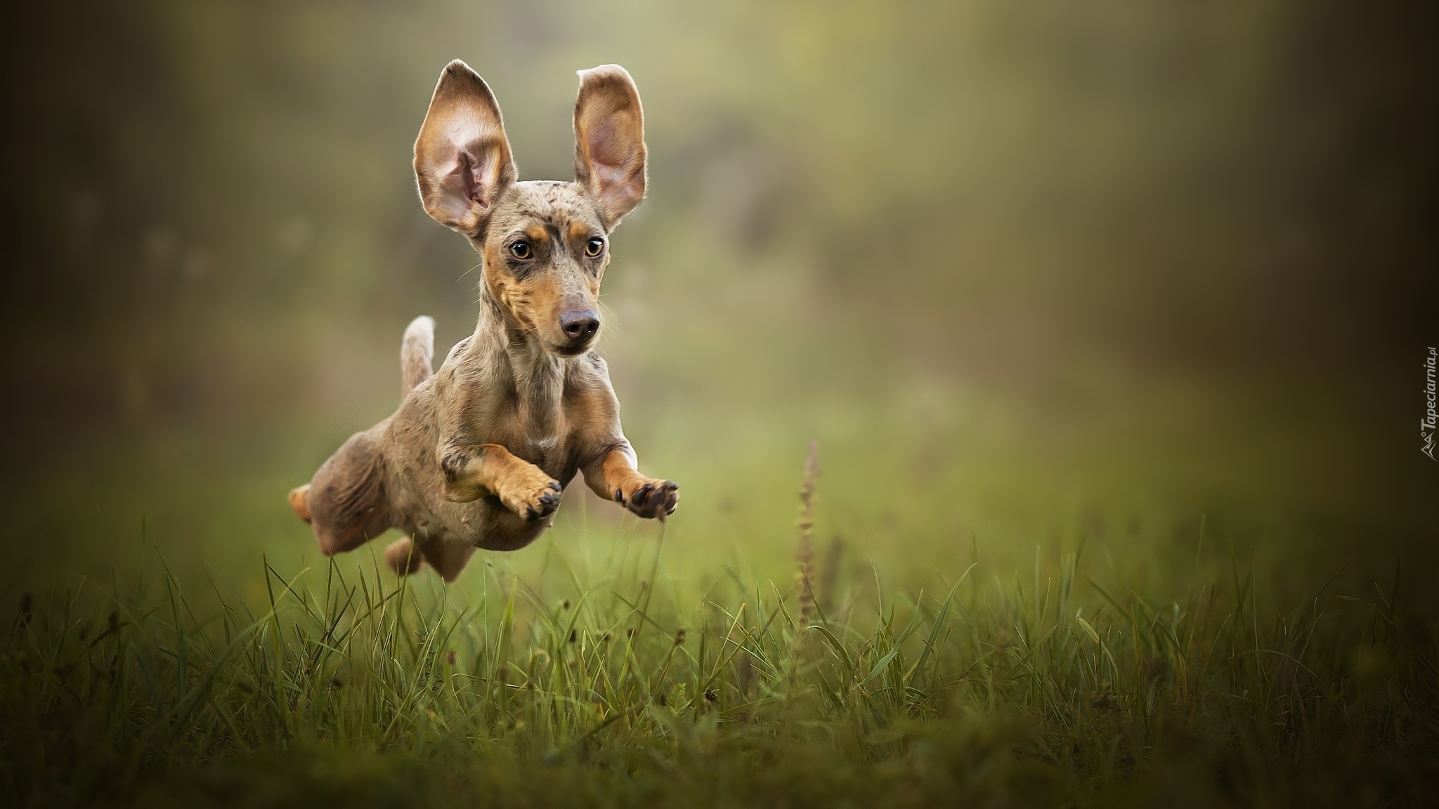 Edytor tapety: Jamnik krótkowłosy w podskoku nad trawą
