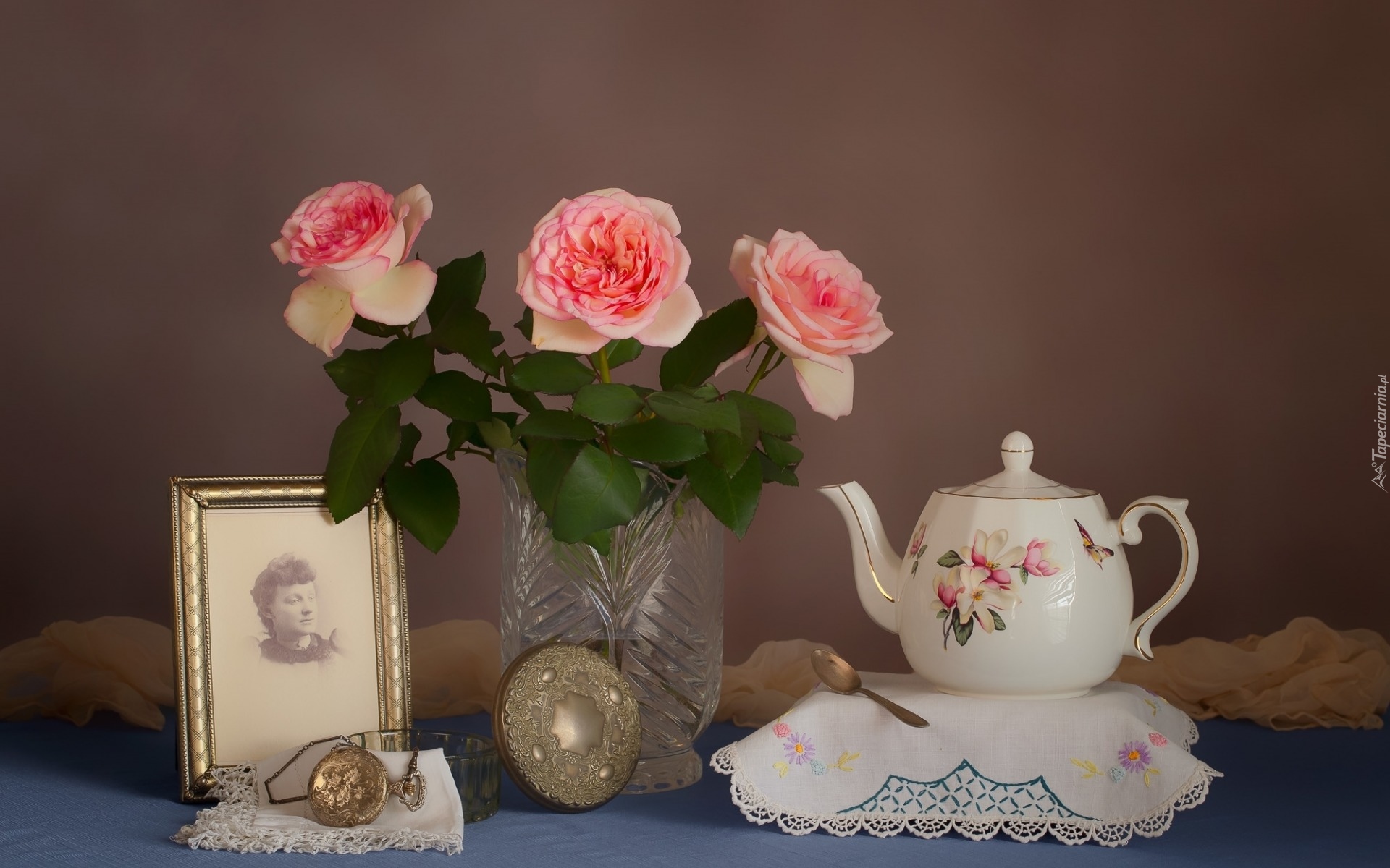 Edytor tapety: Fotografia w ramce obok kwiatów w wazonie