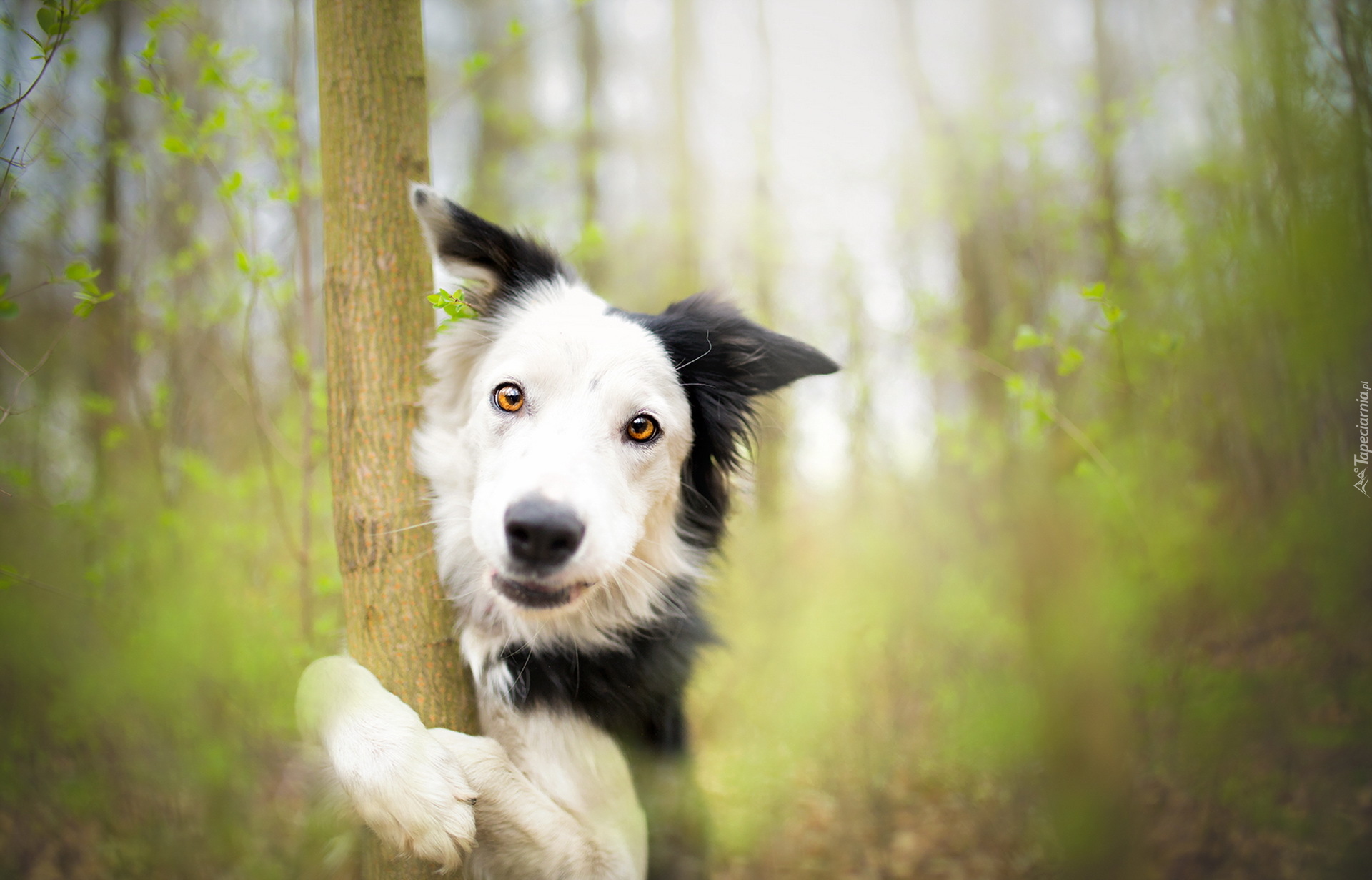 Edytor tapety: Border collie obejmujący drzewo
