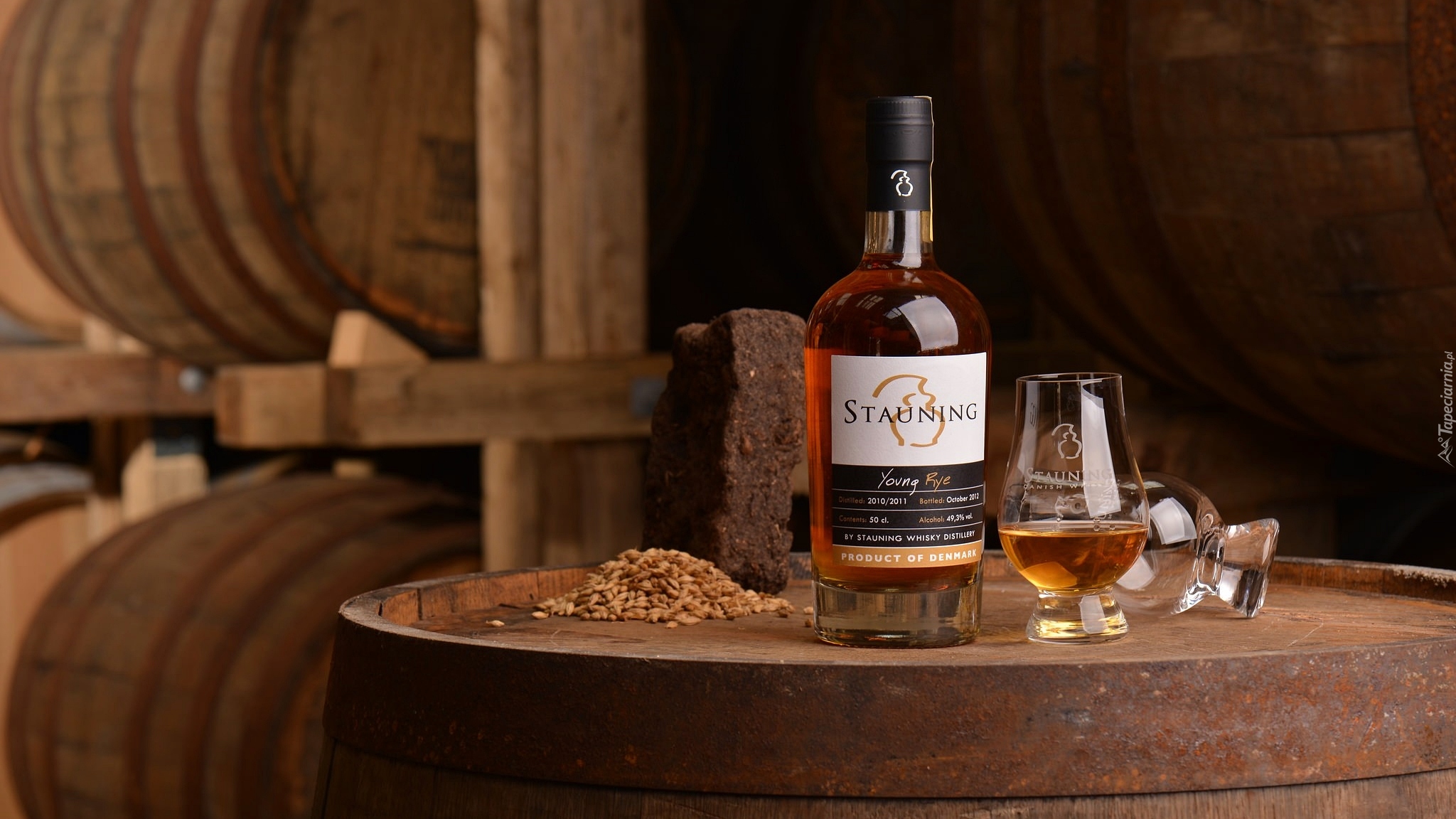 Edytor tapety: Butelka whisky z kieliszkami na beczce