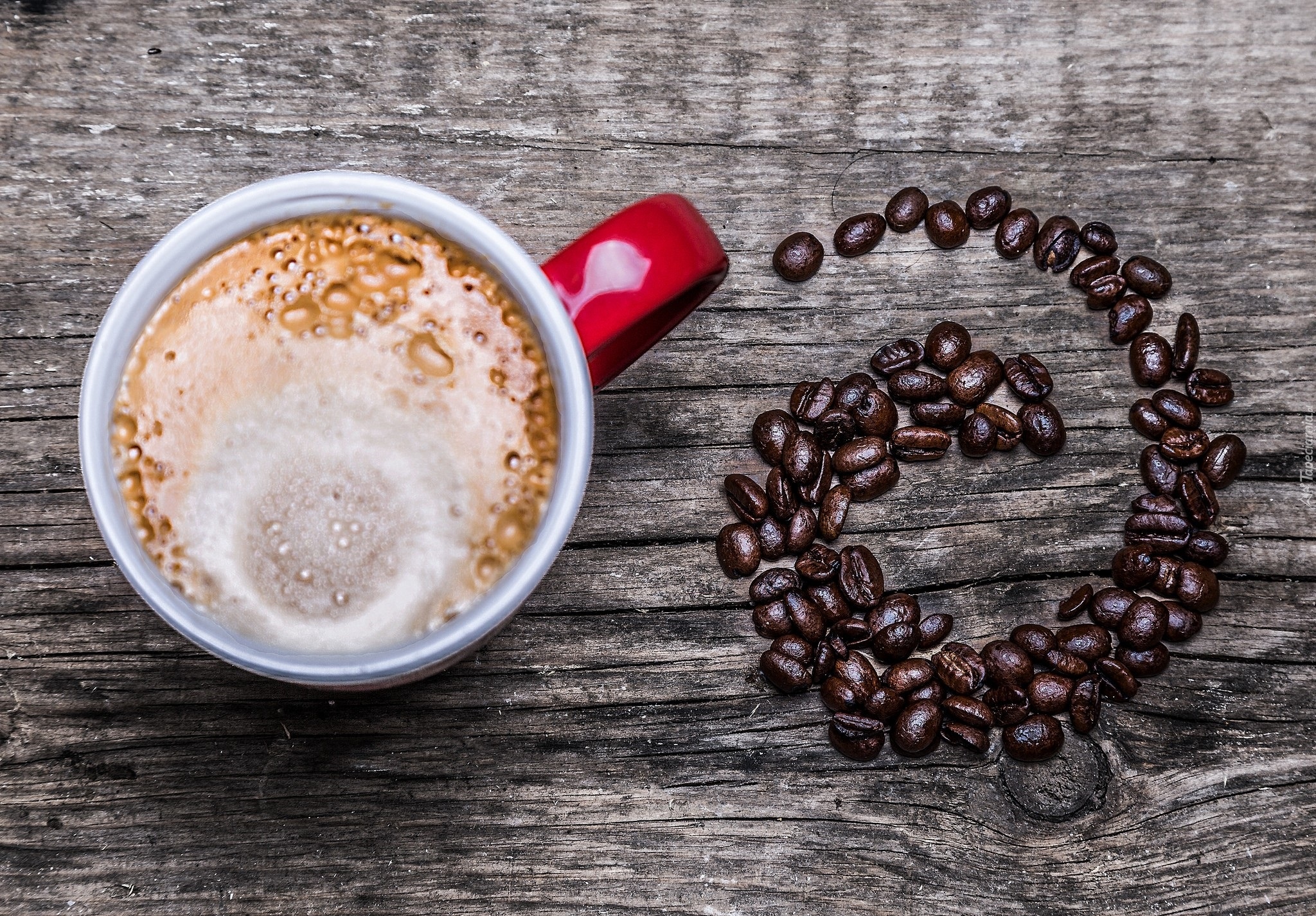 Edytor tapety: Kubek kawy obok ziaren na deskach