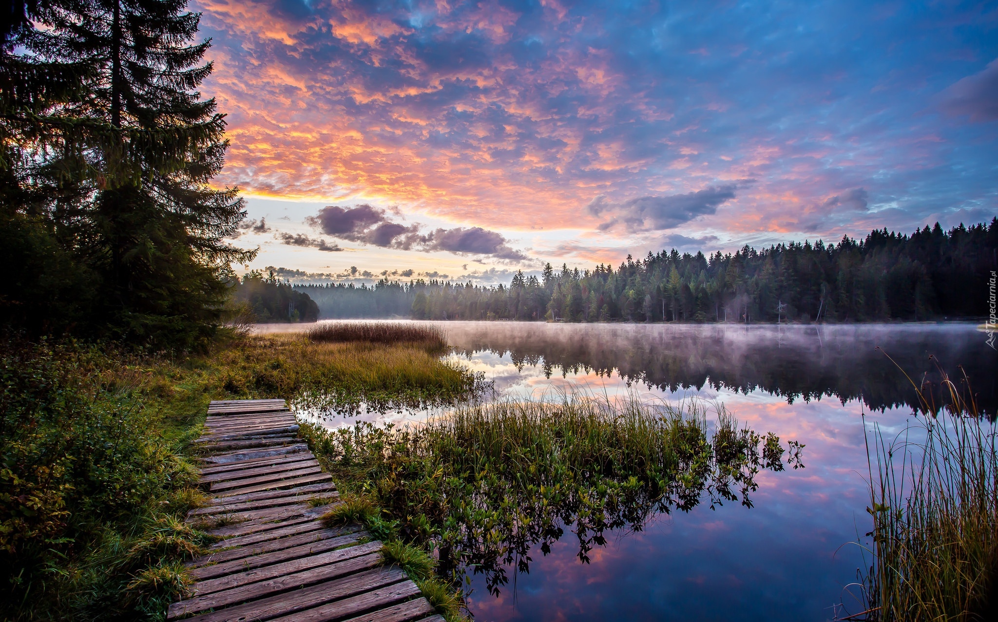 Edytor tapety: Drewniany pomost na jeziorze zarastającym roślinami