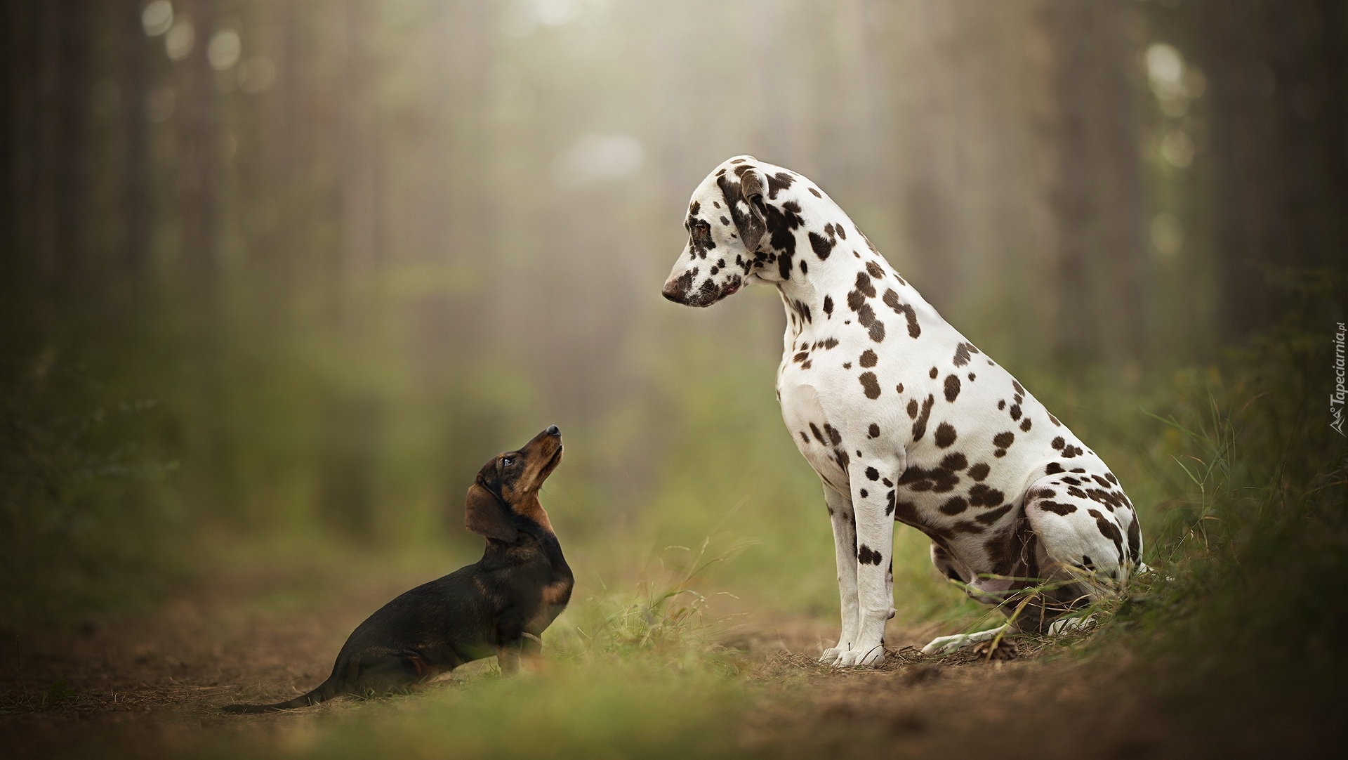 Edytor tapety: Jamnik z dalmatyńczykiem w lesie
