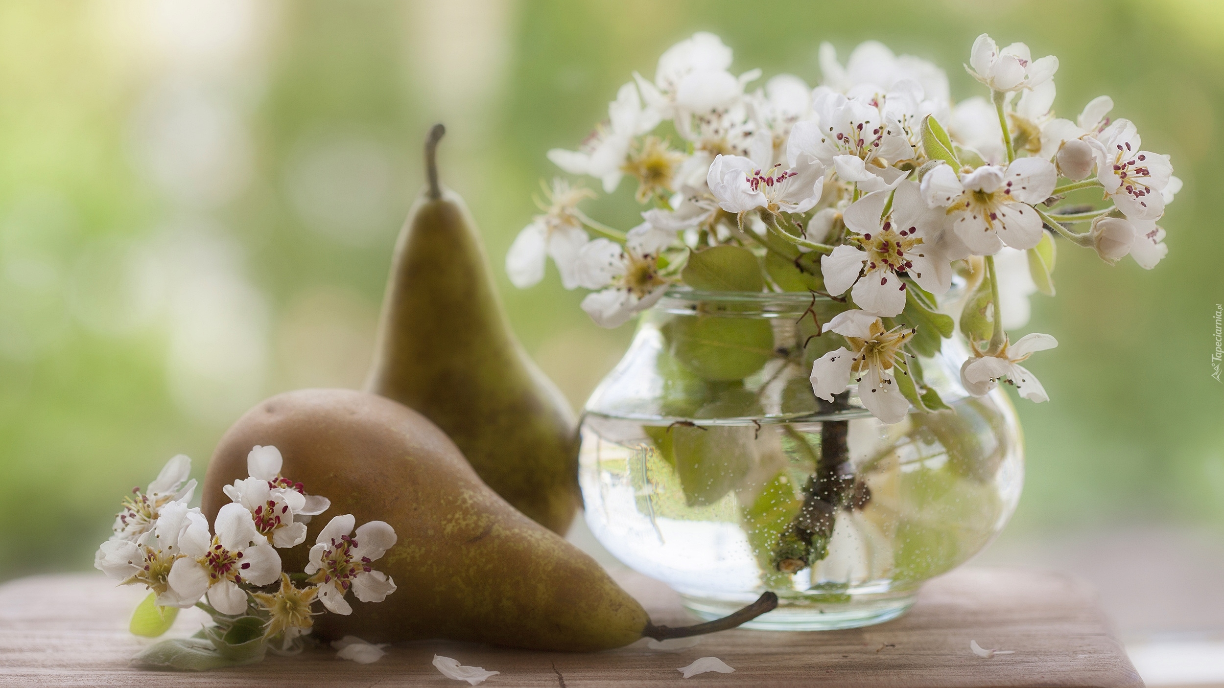 Edytor tapety: Gruszki położone obok wazonika z kwitnącą gałązką gruszy