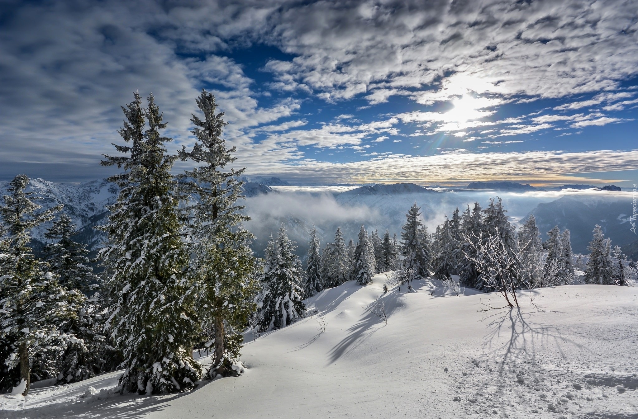 Edytor tapety: Zimowa sceneria z ośnieżonymi świerkami na stoku