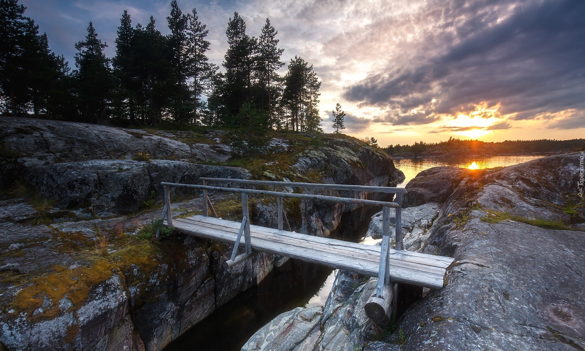 Edytor tapety: Mostek nad rzeczką w promieniach wschodzącego słońca