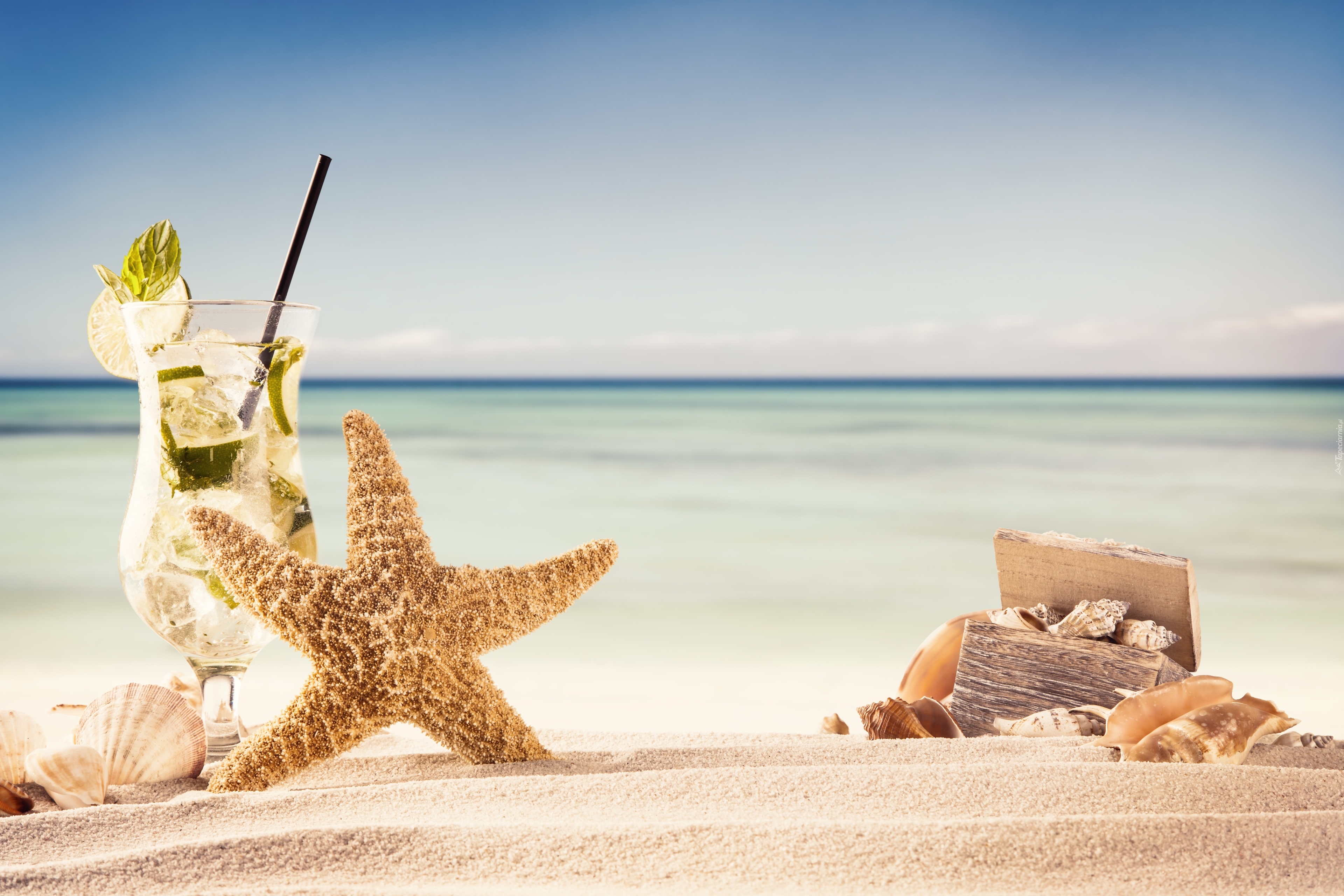 Edytor tapety: Drink na piasku z rozgwiazdą i muszelkami
