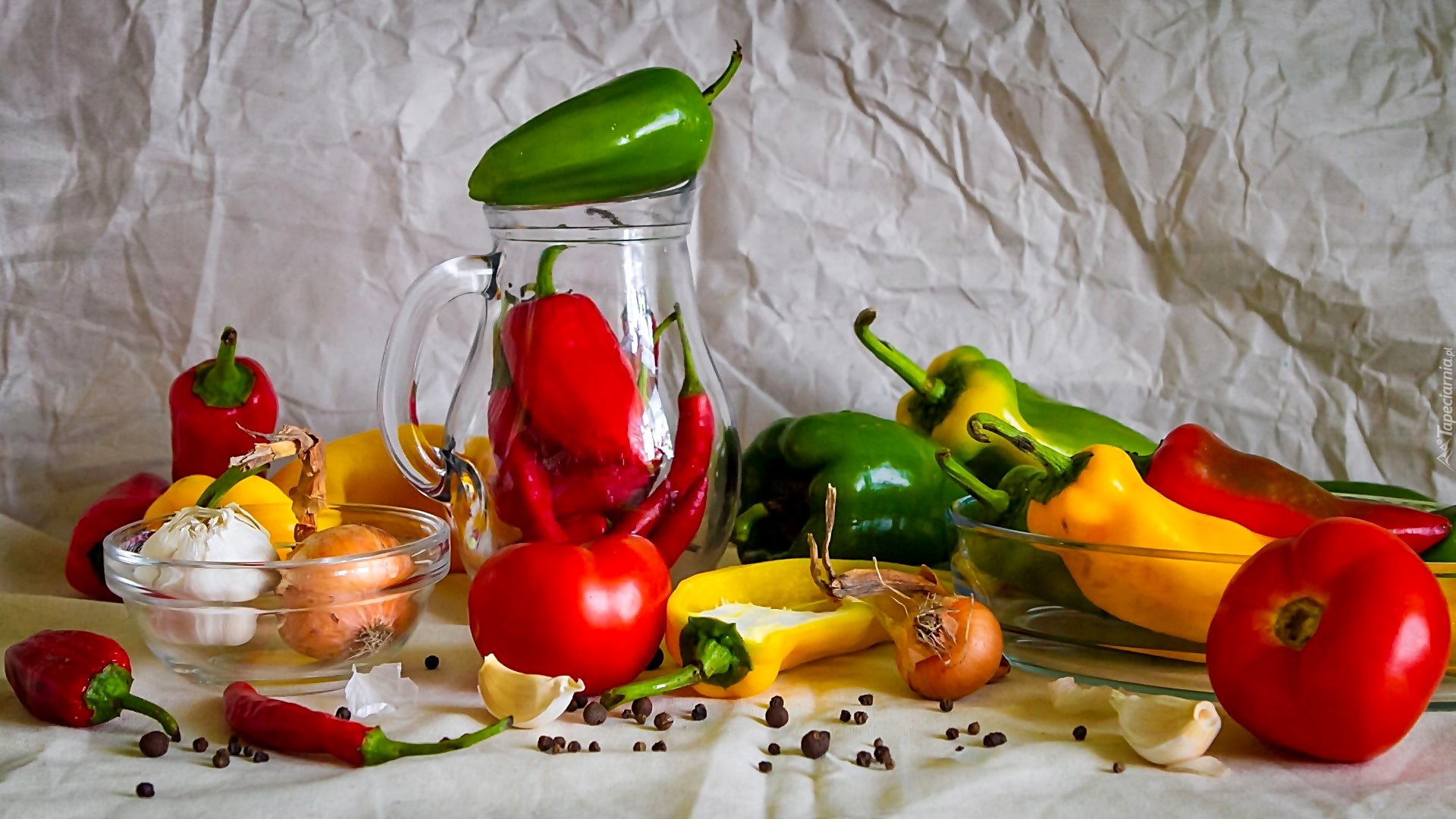Edytor tapety: Papryka w dzbanku obok cebuli i pomidorów