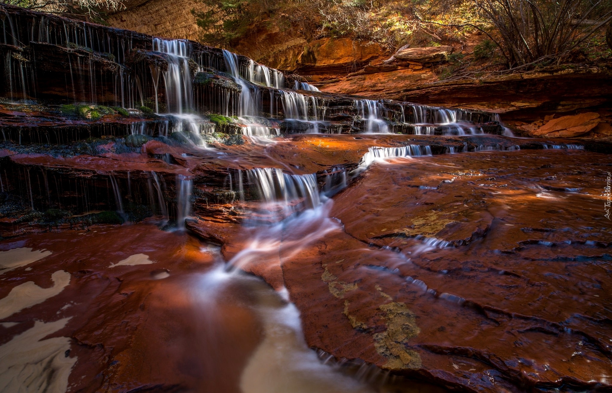 Edytor tapety: Wodospad spływający kaskadowo po skałach