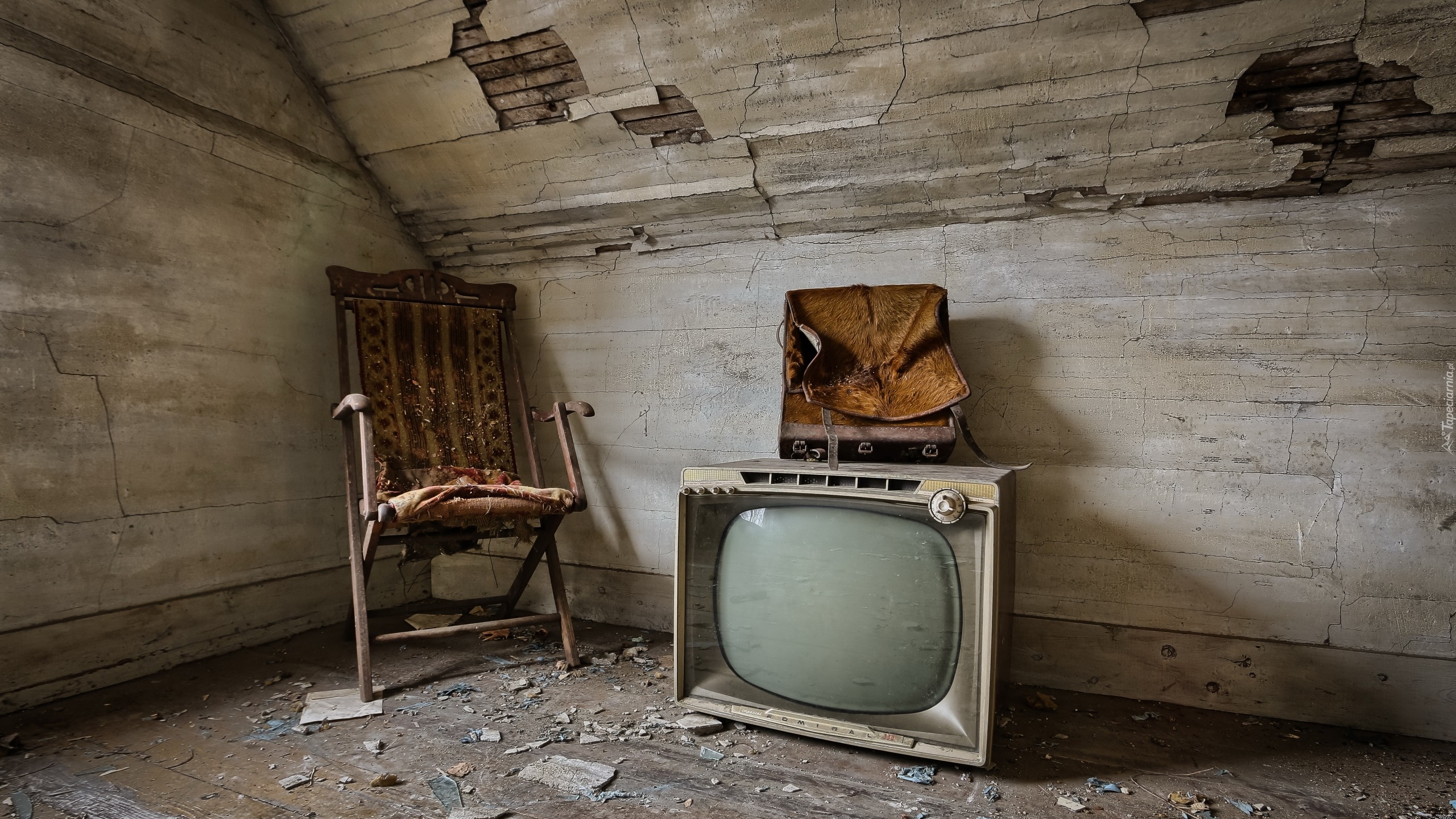 Edytor tapety: Krzesło i stary telewizor na strychu