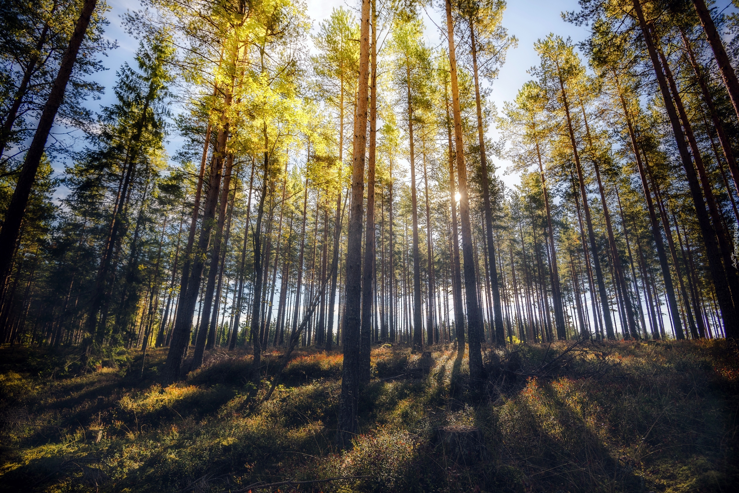 Edytor tapety: Promienie słoneczne między drzewami w lesie