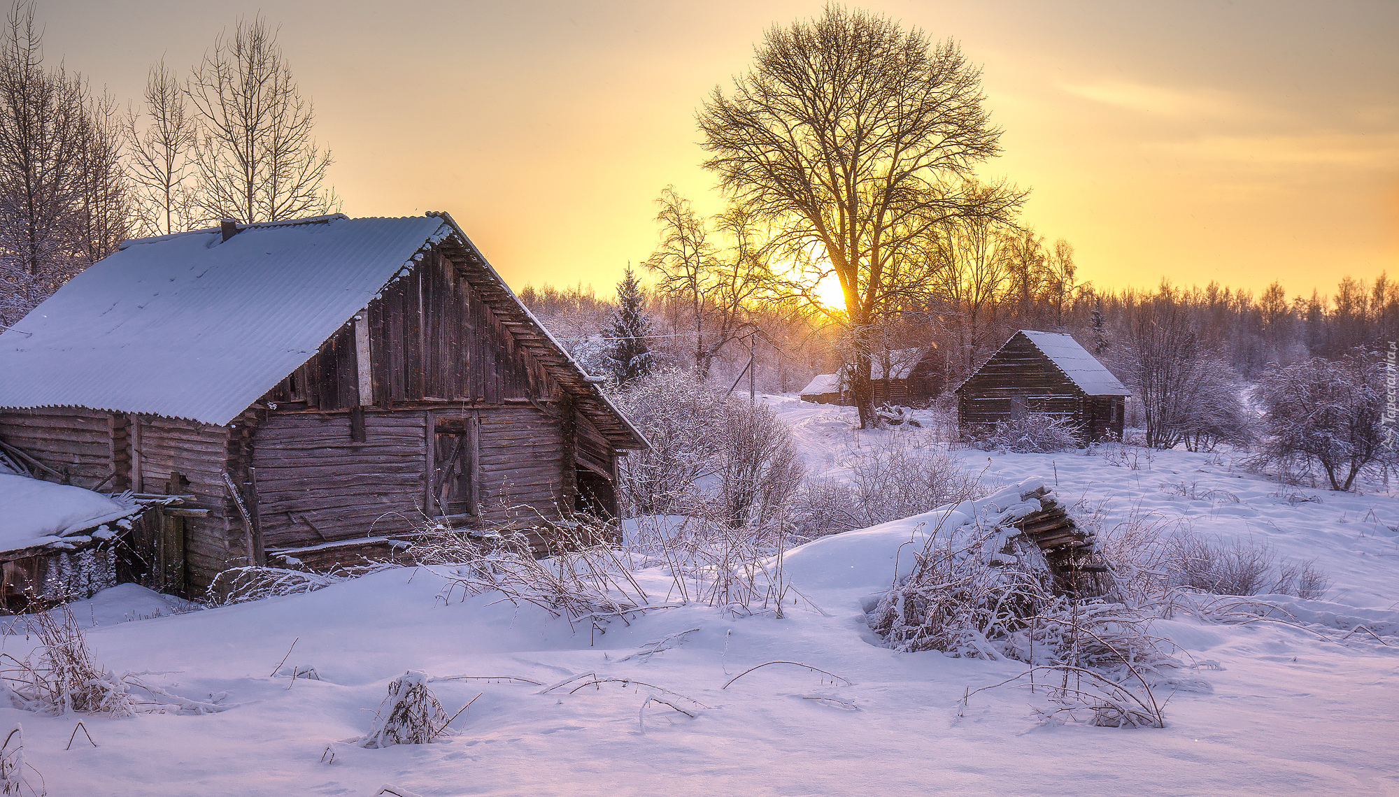 Edytor tapety: Ośnieżone zabudowania i drzewa w blasku wschodzącego słońca