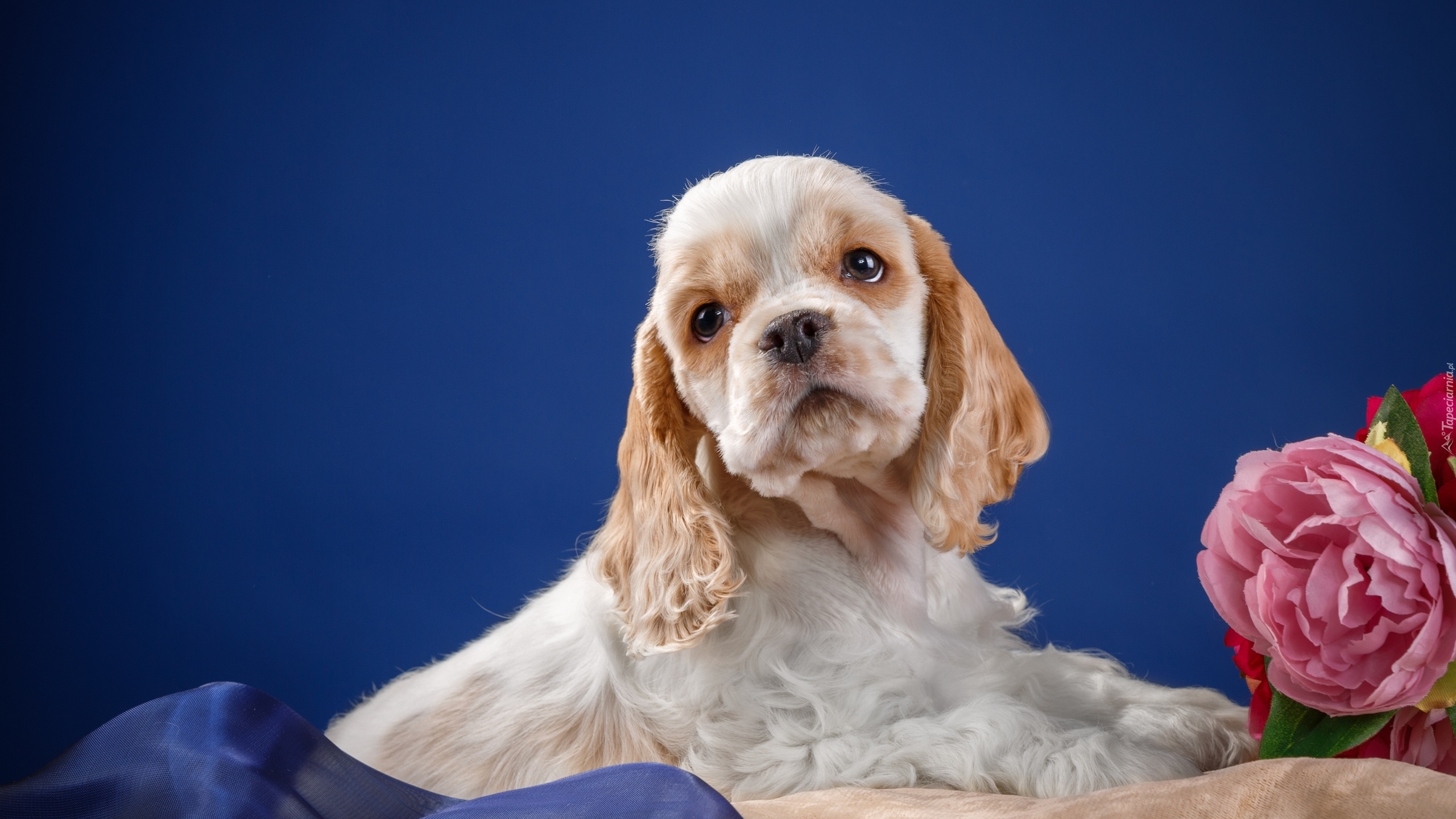 Edytor tapety: Smutny spaniel ze sztucznym kwiatem na niebieskim tle