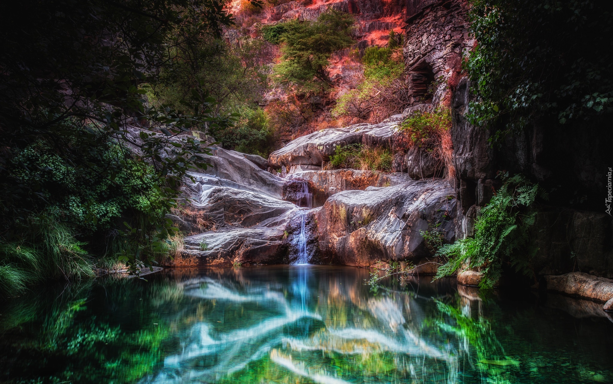 Edytor tapety: Skały i wodospad w odbiciu