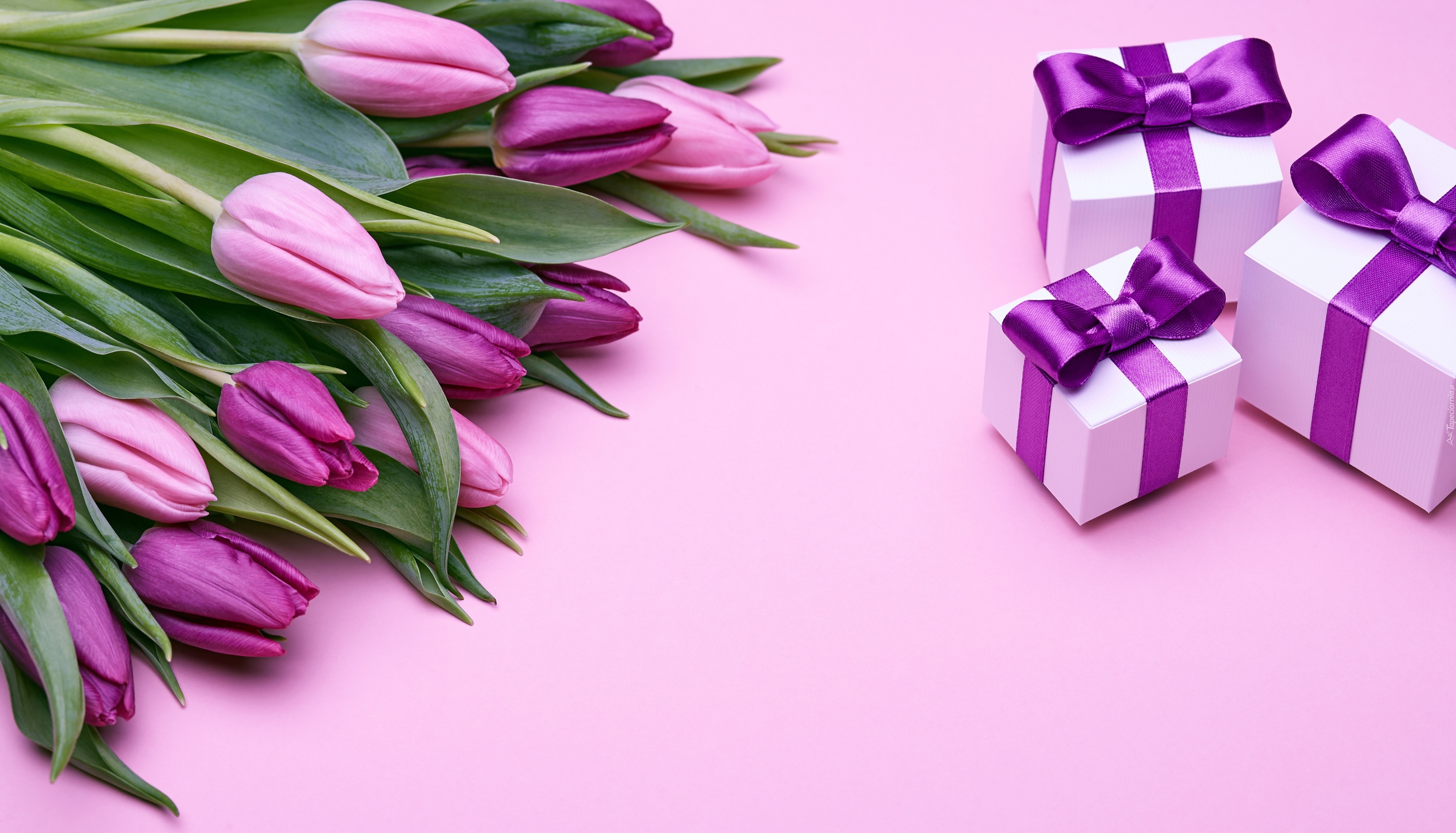 Edytor tapety: Tulipany położone obok prezentów