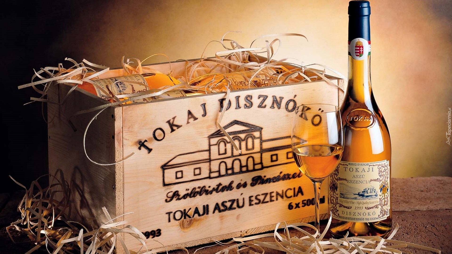 Edytor tapety: Butelka i kieliszek z winem obok skrzynki