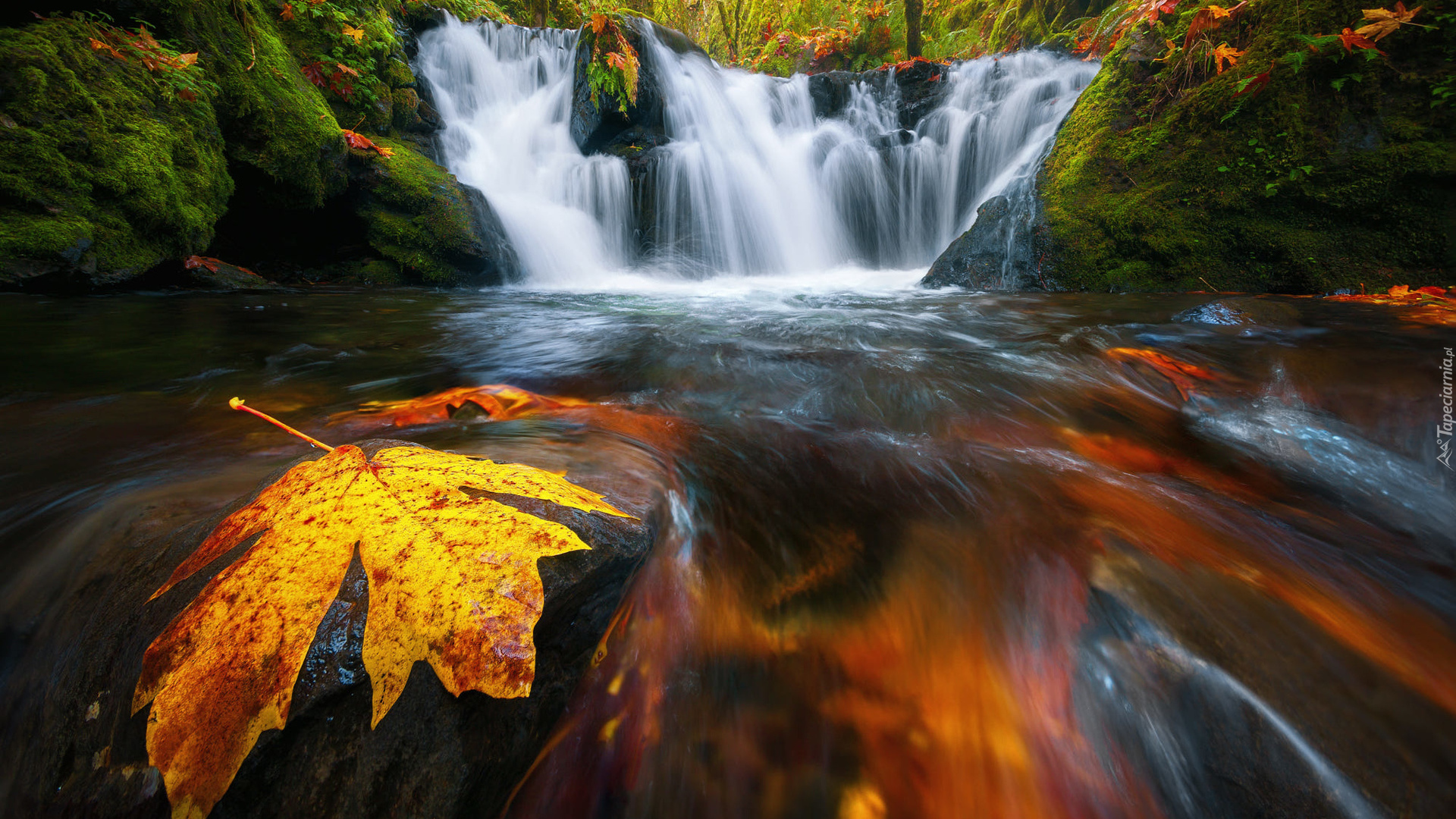 Edytor tapety: Wodospad na omszałych skałach