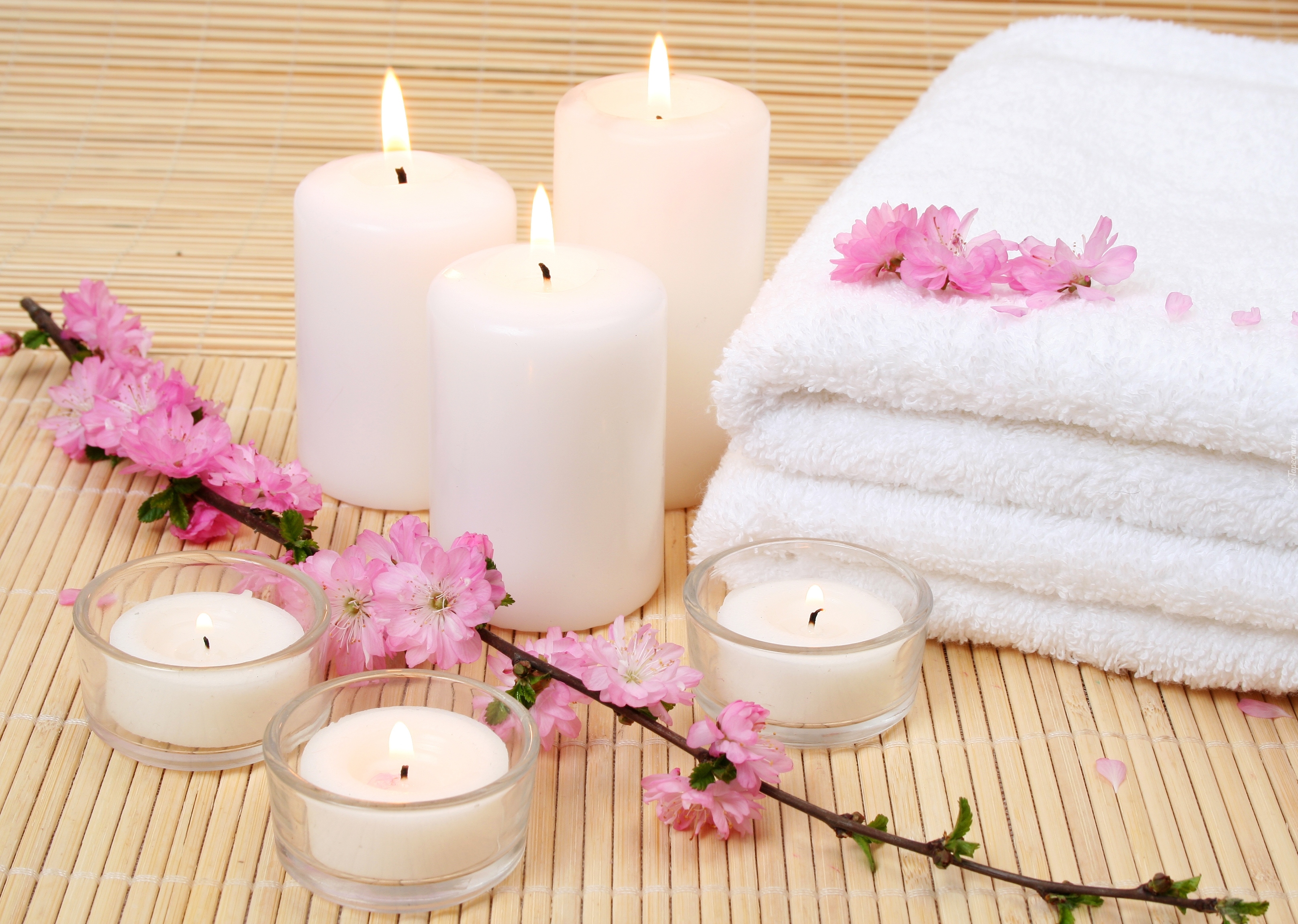 Edytor tapety: Gałązka migdałka obok świec i ręczników w SPA