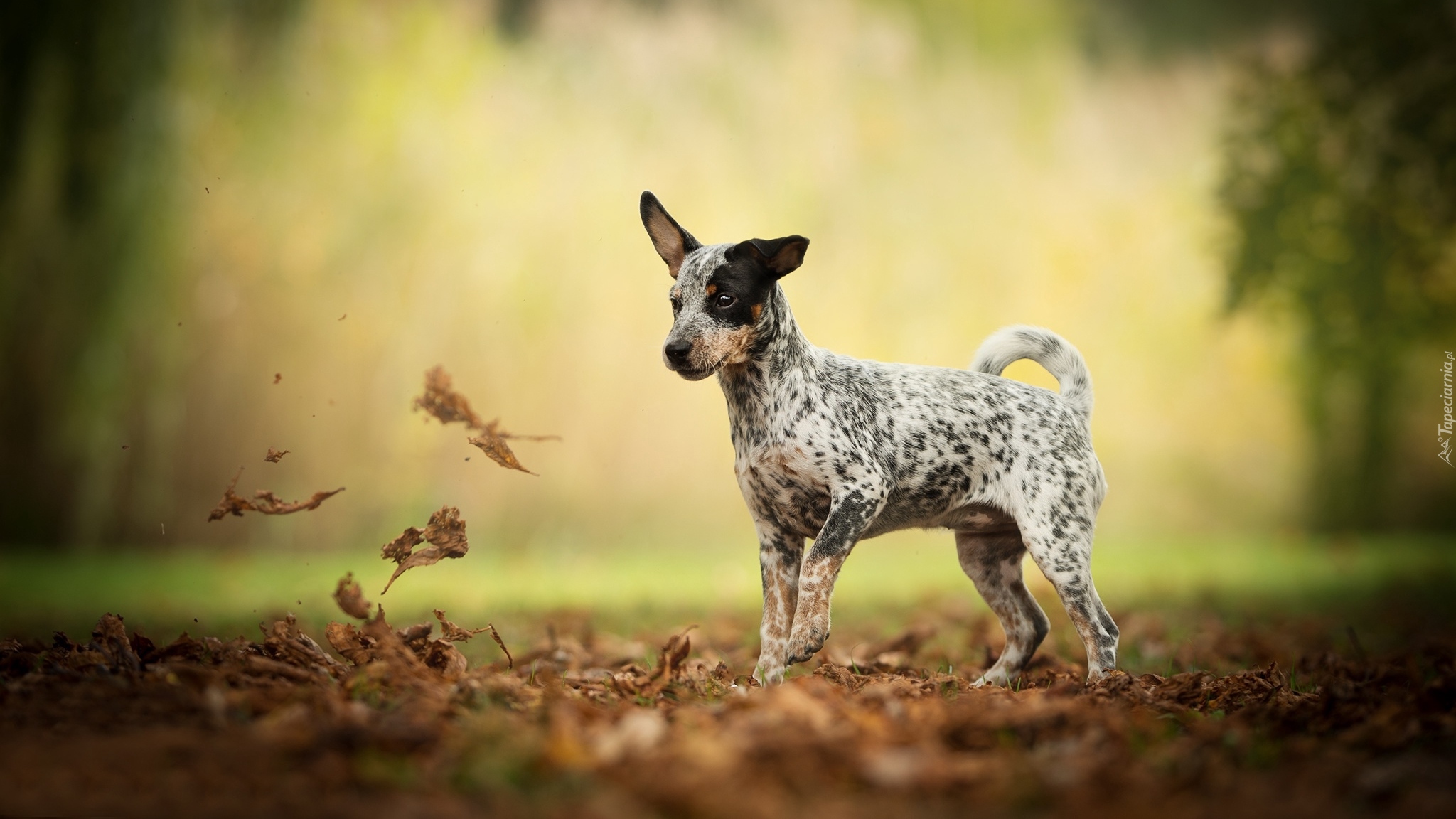 Edytor tapety: Pies w liściach na polanie