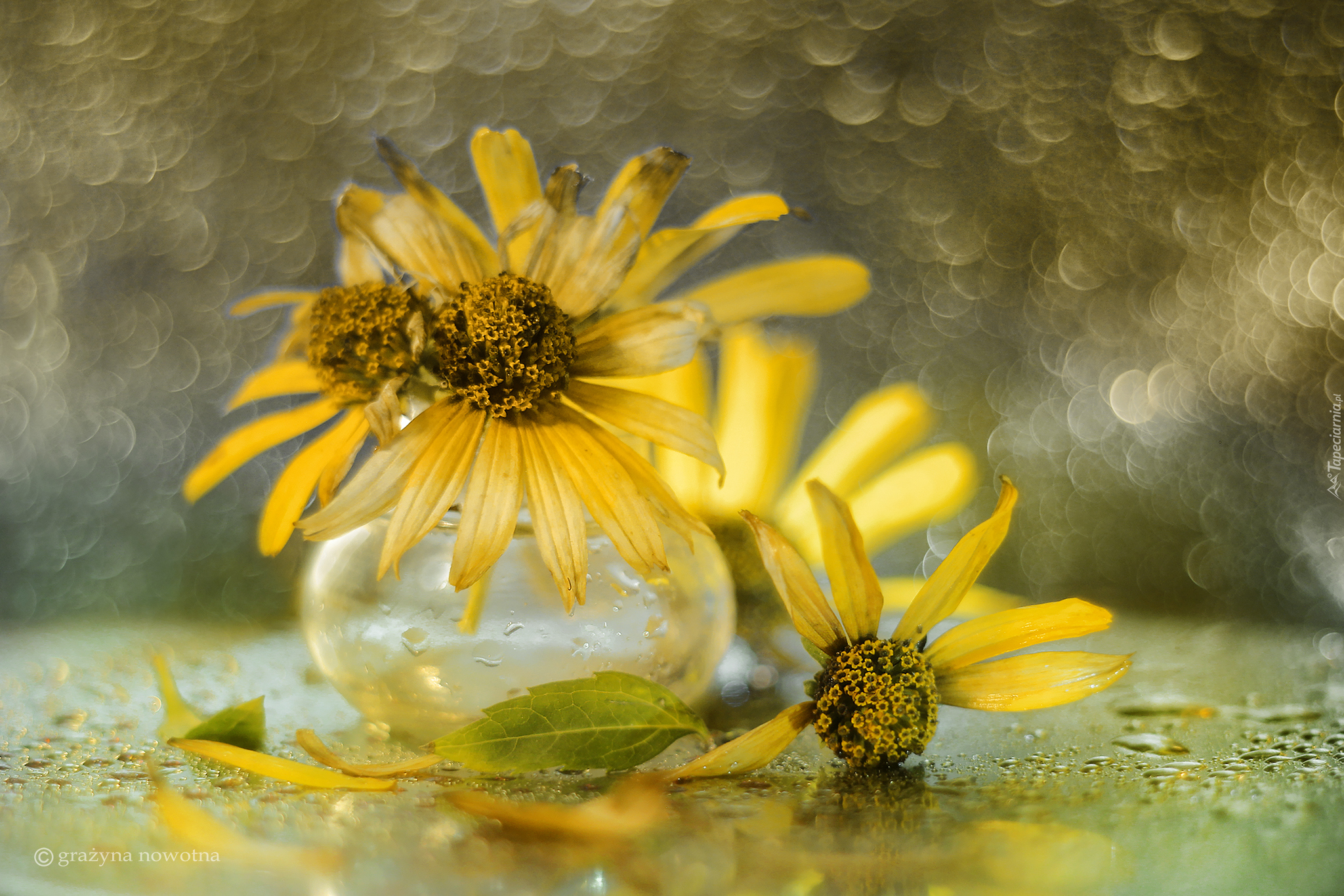 Edytor tapety: Słoneczniczki szorstkie w wazoniku w bokeh
