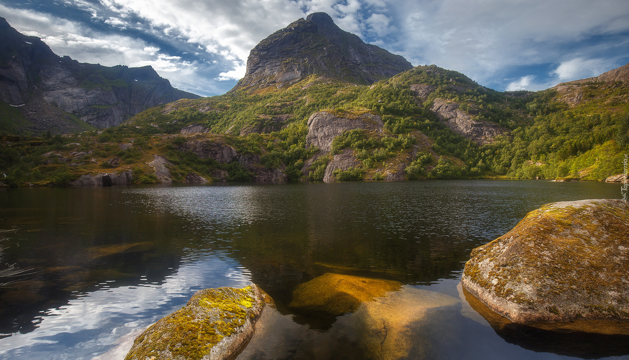 Edytor tapety: Omszałe skały nad górskim jeziorem