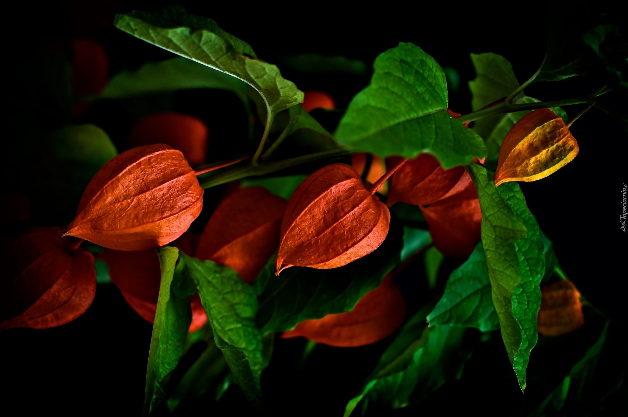 Edytor tapety: Miechunka z liśćmi na czarnym tle