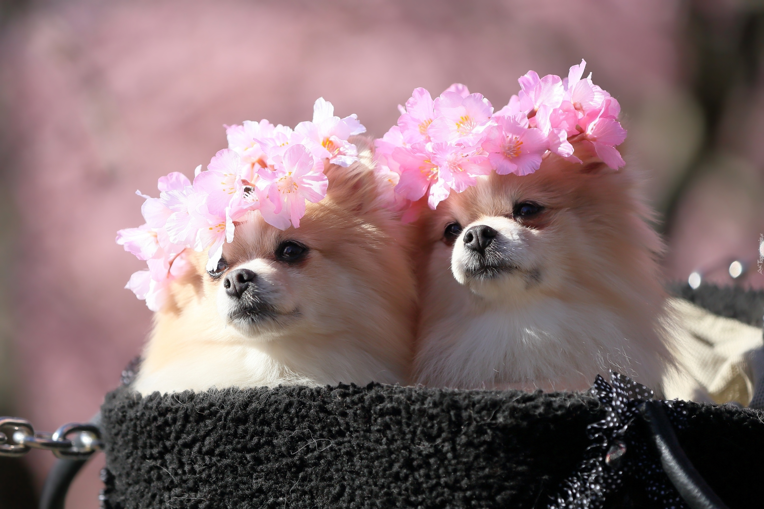 Edytor tapety: Dwa psy rasy szpic w kwiatowych wiankach