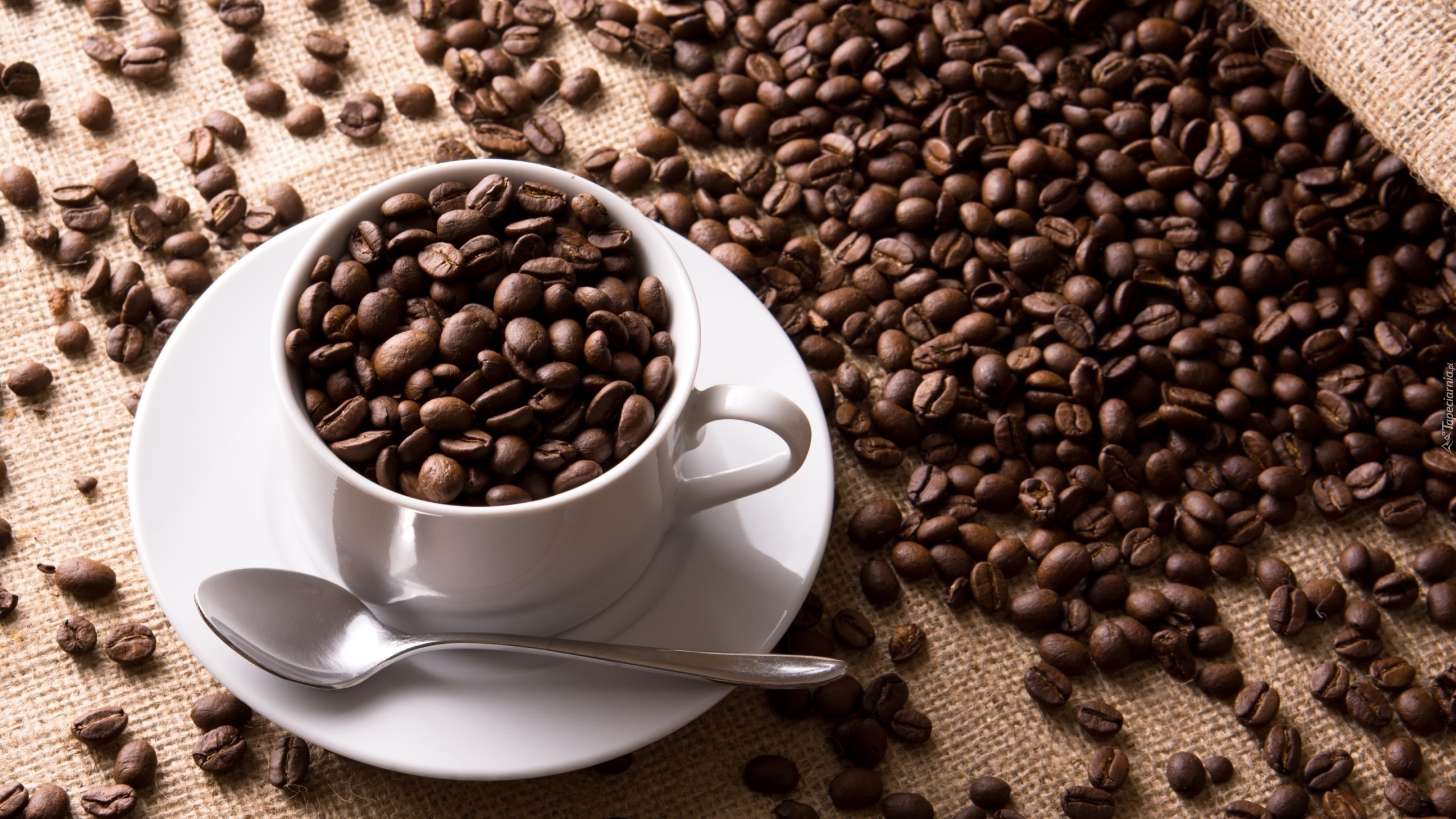 Edytor tapety: Ziarna kawy w filiżance i rozsypane obok