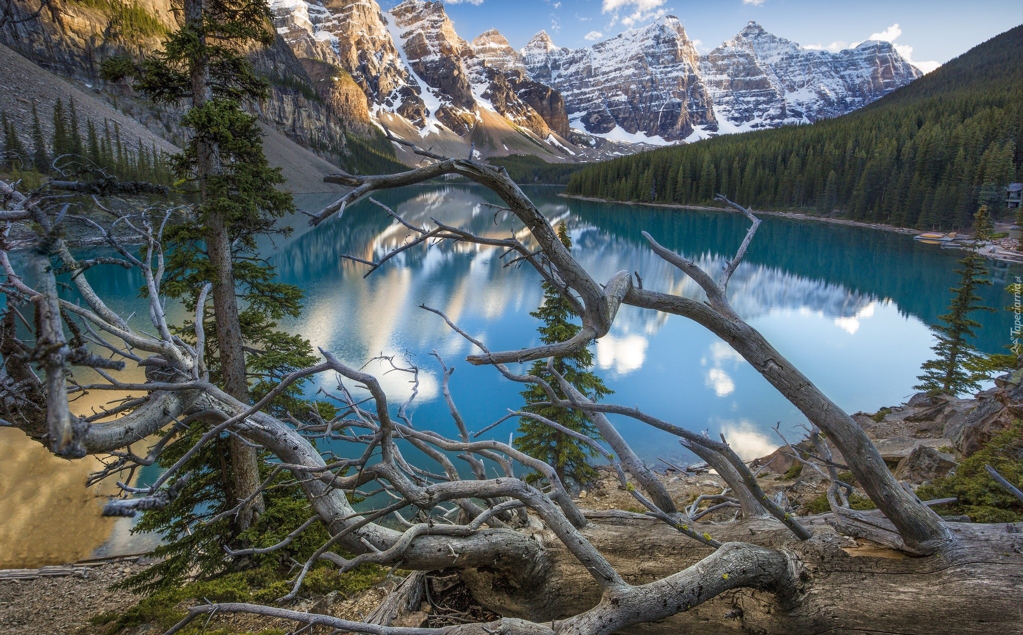 Edytor tapety: Powalone drzewo nad jeziorem Moraine w Kanadzie