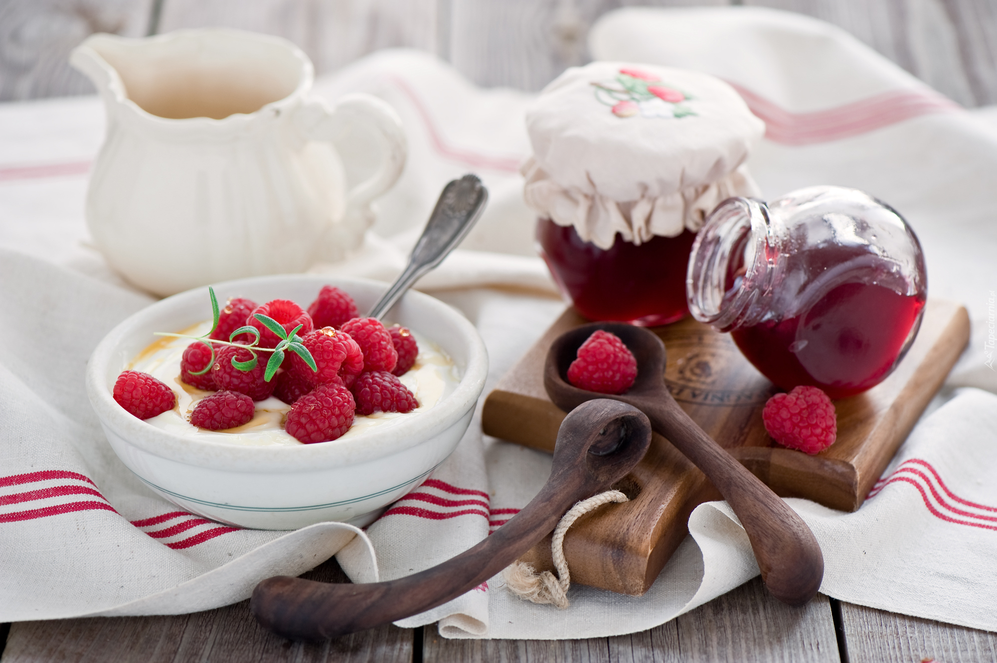 Edytor tapety: Maliny w jogurcie obok dżemu malinowego