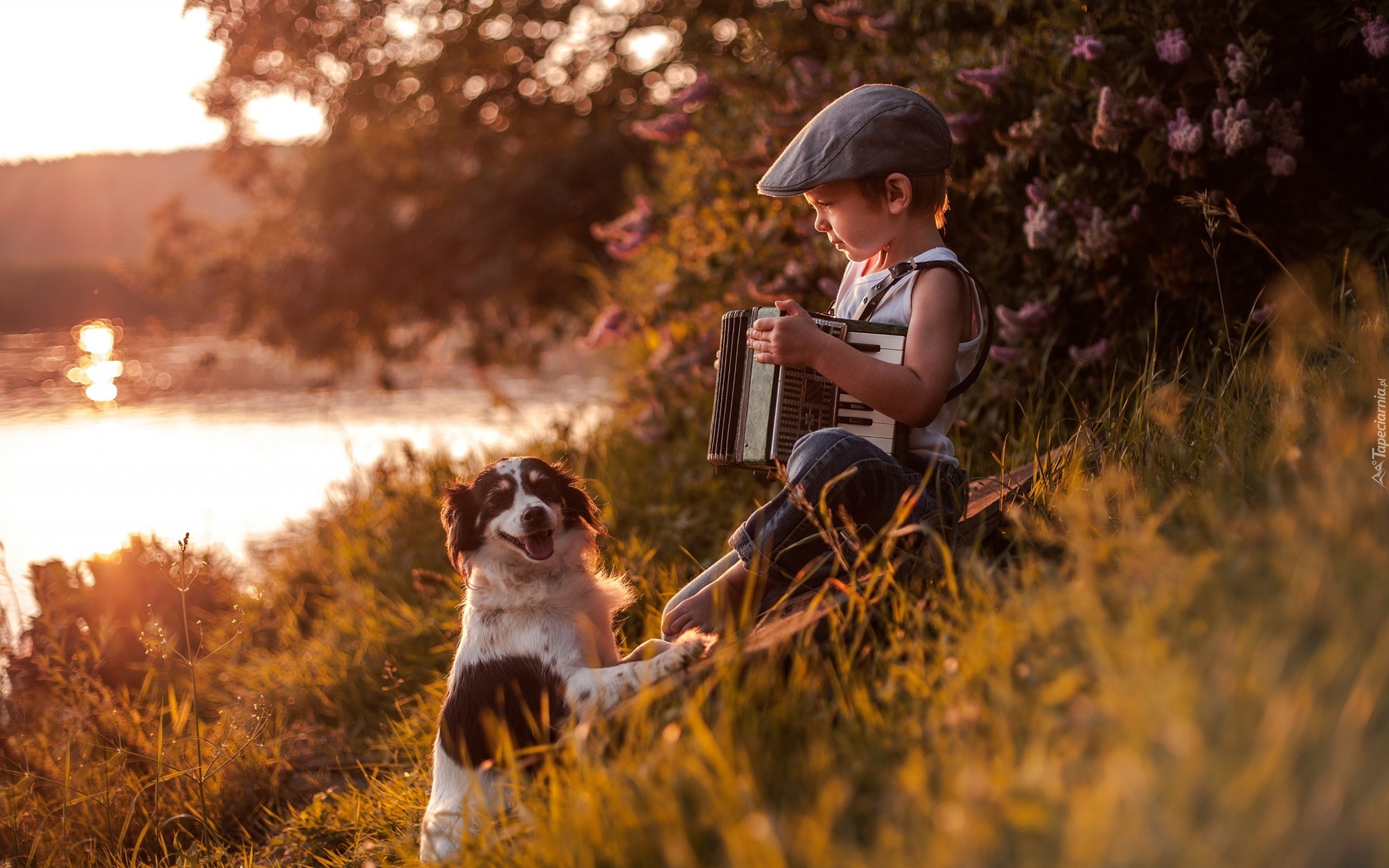 Edytor tapety: Chłopczyk z akordeonem i pieskiem nad rzeką