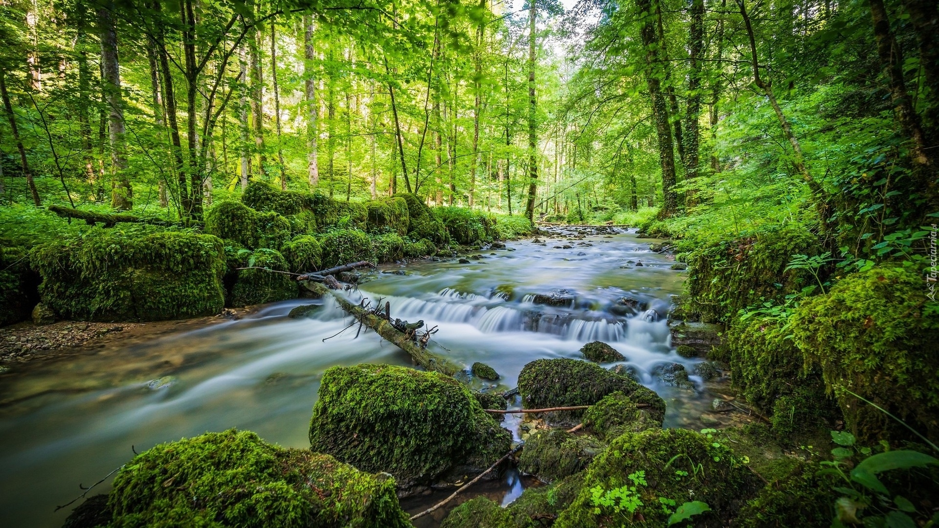 Edytor tapety: Leśna rzeka płynąca po omszałych kamieniach