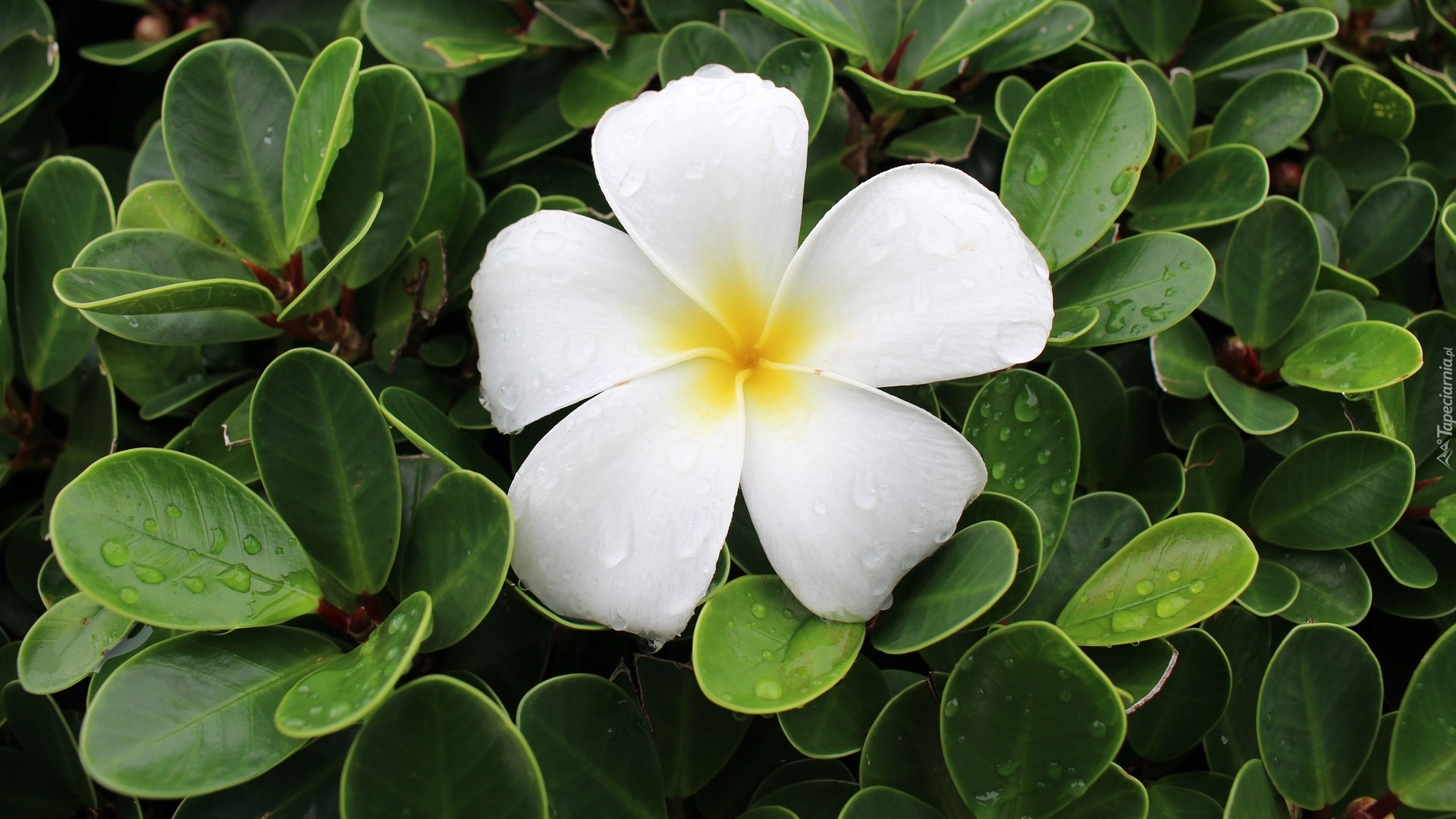 Edytor tapety: Kwiat plumerii na zielonych listkach