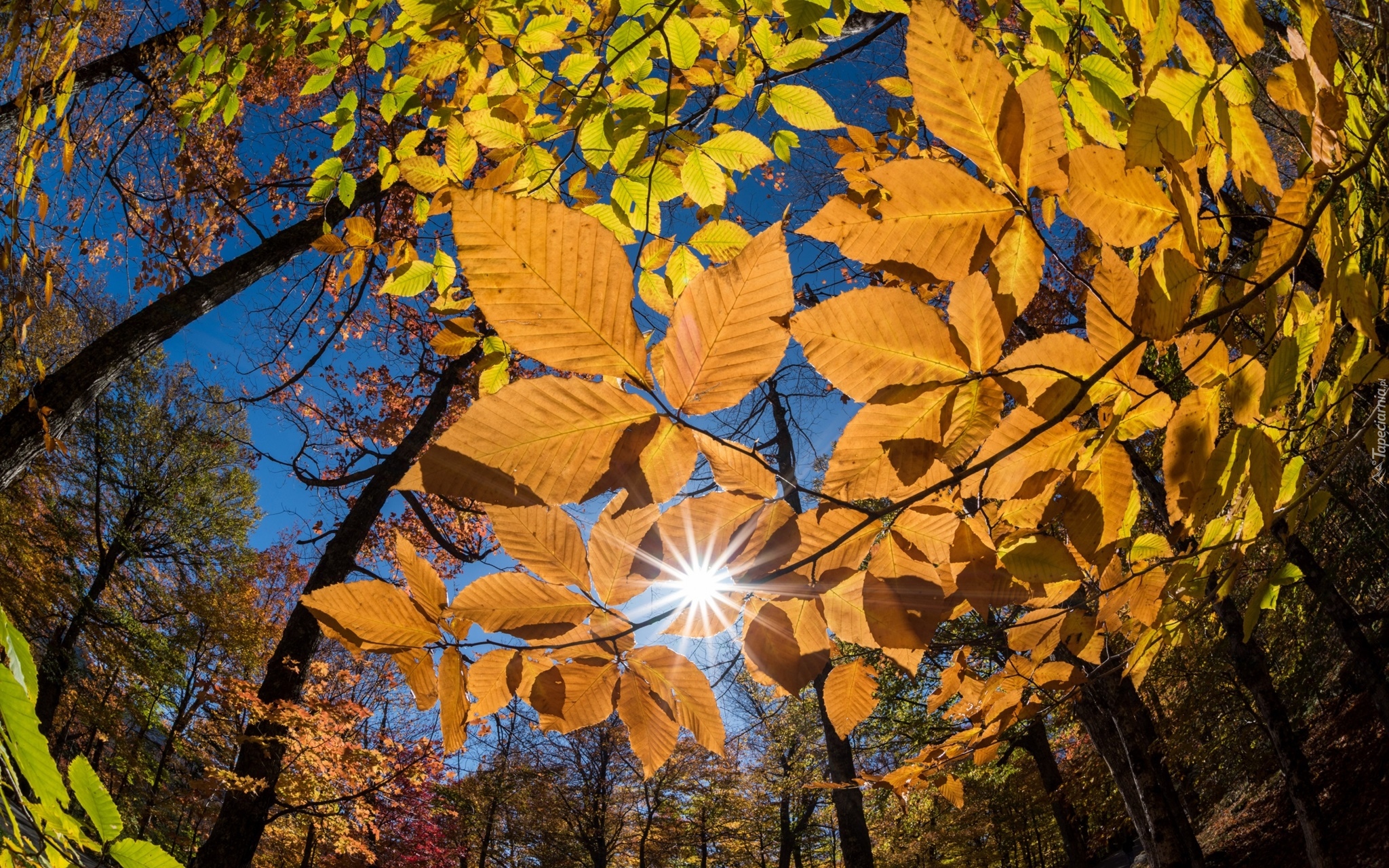 Edytor tapety: Jesienne liście drzew w promieniach słońca