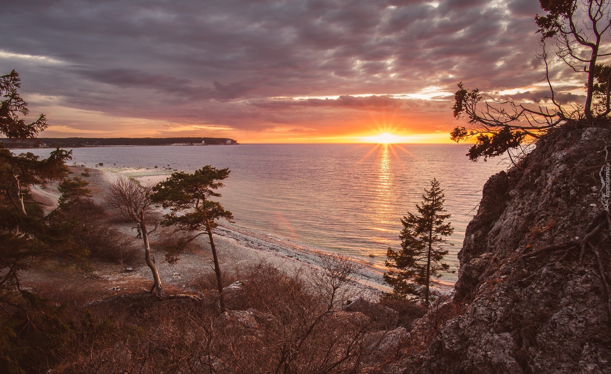 Edytor tapety: Skalne wybrzeże porośnięte drzewami w blasku zachodzącego słońca