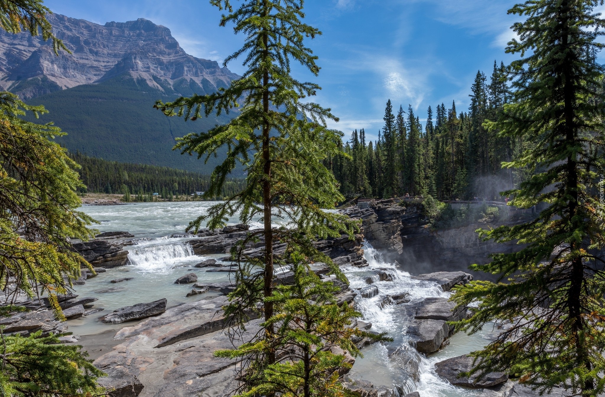 Edytor tapety: Świerki przy brzegu górskiej rzeki