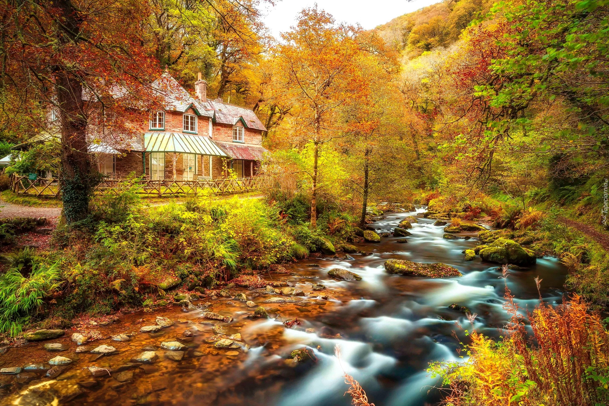 Edytor tapety: Dom nad rzeką w jesiennej scenerii