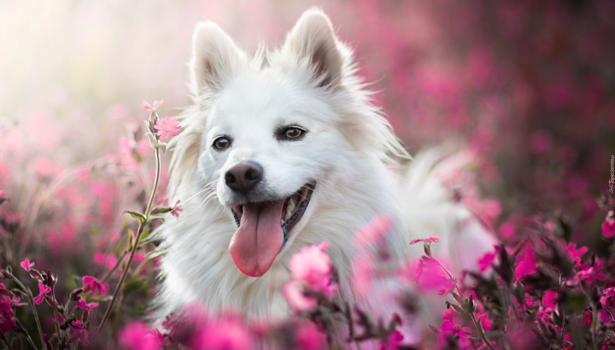 Edytor tapety: Biały pies w kwiatach