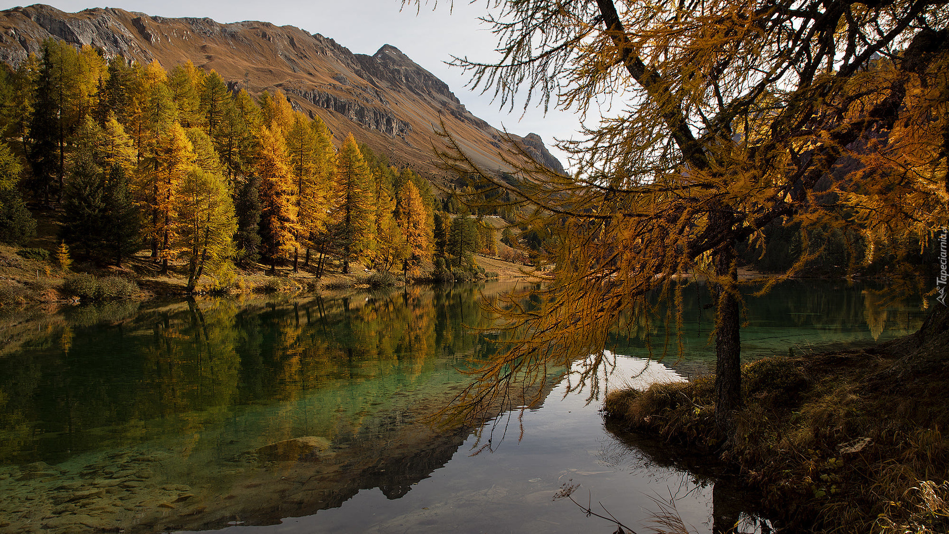 Edytor tapety: Drzewa i góry przeglądają się w jeziorze
