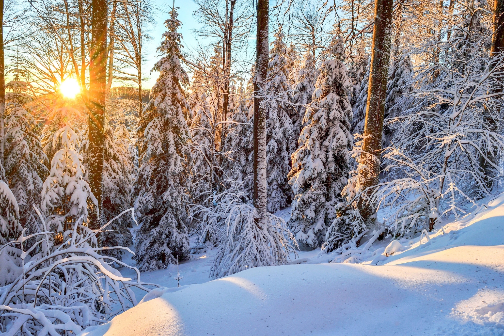 Edytor tapety: Zimowy wschód słońca w lesie