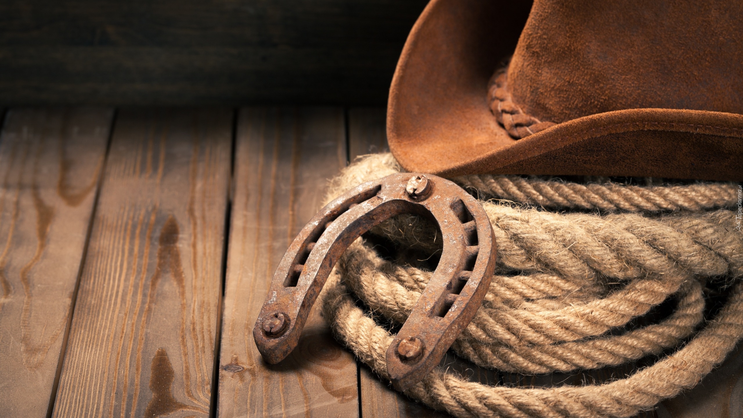Edytor tapety: Zardzewiała podkowa położona na sznurze obok kapelusza